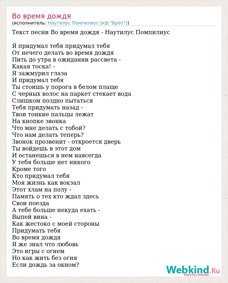 Текст песни Во время дождя - Наутилус Помпилиус Я придумал тебя придумал тебя От нечего делать во время дождя Пить до утра в ожидании рассвета - Какая тоска! - Я зажмурил глаза И придумал тебя Ты стоишь у порога в белом плаще С черных волос на паркет стекает вода Слишком поздно пытаться Тебя придумать назад - Твои тонкие пальцы лежат На кнопке звонка Что мне делать с тобой? Что нам делать теперь? Звонок прозвенит - откроется дверь Ты войдешь в этот дом И останешься в нем навсегда У тебя больше нет никого Кроме того Кто придумал тебя Моя жизнь как вокзал Этот хлам на полу - Память о тех кто ждал здесь Свои поезда А тебе больше некуда ехать - Выпей вина - Как жестоко с моей стороны Придумать тебя Во время дождя Я же знал что любовь Это игры с огнем Но как жить без огня Если дождь за окном?