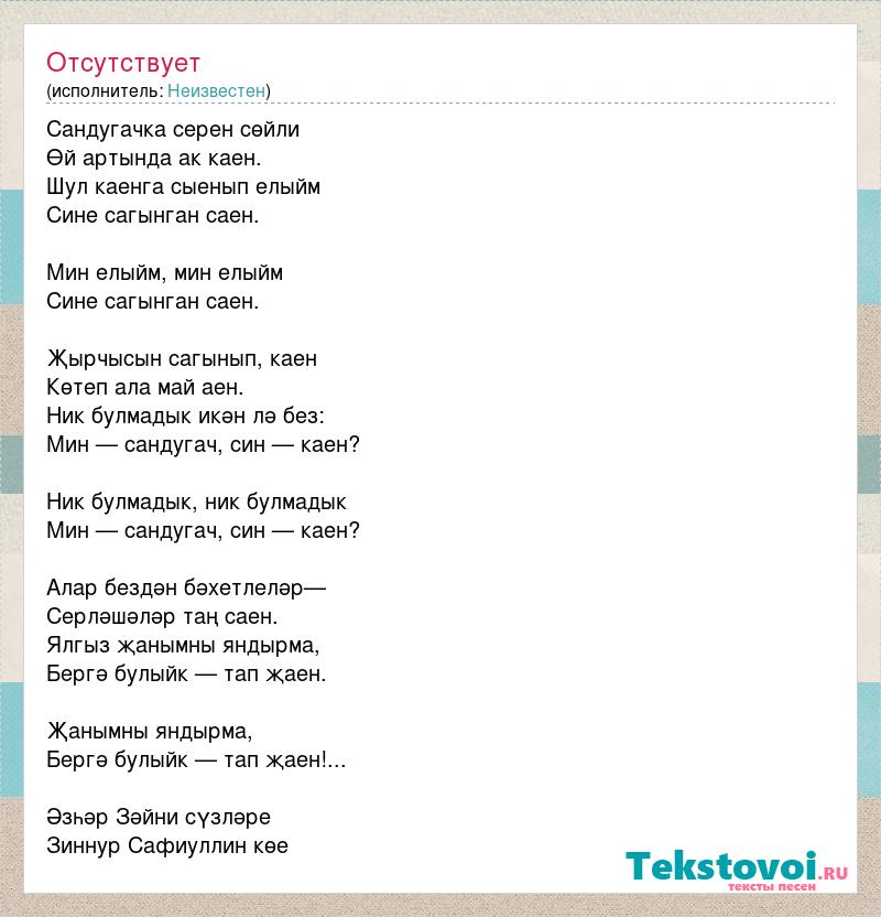 Сандугачка серен сөйли Өй артында ак каен. Шул каенга сыенып елыйм Сине сагынган саен. Мин елыйм, мин елыйм Сине сагынган саен. Җырчысын сагынып, каен Көтеп ала май аен. Ник булмадык икән лә без: Мин — сандугач, син — каен? Ник булмадык, ник булмадык Мин — сандугач, син — каен? Алар бездән бәхетлеләр— Серләшәләр таң саен. Ялгыз җанымны яндырма, Бергә булыйк — тап җаен. Җанымны яндырма, Бергә булыйк — тап җаен!... Әзһәр Зәйни сүзләре Зиннур Сафиуллин көе