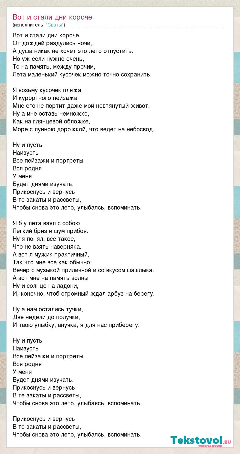 Вот и стали дни короче, От дождей раздулись ночи, А душа никак не хочет это лето отпустить. Но уж если нужно очень, То на память, между прочим, Лета маленький кусочек можно точно сохранить. Я возьму кусочек пляжа И курортного пейзажа Мне его не портит даже мой невтянутый живот. Ну а мне оставь немножко, Как на глянцевой обложке, Море с лунною дорожкой, что ведет на небосвод. Ну и пусть Наизусть Все пейзажи и портреты Вся родня У меня Будет днями изучать. Прикоснусь и вернусь В те закаты и рассветы, Чтобы снова это лето, улыбаясь, вспоминать. Я б у лета взял с собою Легкий бриз и шум прибоя. Ну я понял, все такое, Что не взять наверняка. А вот я мужик практичный, Так что мне все как обычно: Вечер с музыкой приличной и со вкусом шашлыка. А вот мне на память волны Ну и солнце на ладони, И, конечно, чтоб огромный ждал арбуз на берегу. Ну а нам остались тучки, Две недели до получки, И твою улыбку, внучка, я для нас приберегу. Ну и пусть Наизусть Все пейзажи и портреты Вся родня У меня Будет днями изучать. Прикоснусь и вернусь В те закаты и рассветы, Чтобы снова это лето, улыбаясь, вспоминать. Прикоснусь и вернусь В те закаты и рассветы, Чтобы снова это лето, улыбаясь, вспоминать.