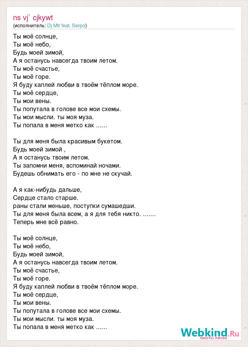 Ты моё солнце, Ты моё небо, Будь моей зимой, А я останусь навсегда твоим летом. Ты моё счастье, Ты моё горе. Я буду каплей любви в твоём тёплом море. Ты моё сердце, Ты мои вены. Ты попутала в голове все мои схемы. Ты мои мысли. ты моя муза. Ты попала в меня метко как ...... Ты для меня была красивым букетом. Будь моей зимой , А я останусь твоим летом. Ты запомни меня, вспоминай ночами. Будешь обнимать его - по мне не скучай. А я как-нибудь дальше, Сердце стало старше. раны стали меньше, поступки сумашедши. Ты для меня была всем, а я для тебя никто. ....... Теперь мне всё равно. Ты моё солнце, Ты моё небо, Будь моей зимой, А я останусь навсегда твоим летом. Ты моё счастье, Ты моё горе. Я буду каплей любви в твоём тёплом море. Ты моё сердце, Ты мои вены. Ты попутала в голове все мои схемы. Ты мои мысли. ты моя муза. Ты попала в меня метко как ......