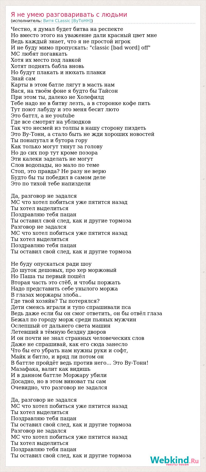 Честно, я думал будет битва на респекте Но вместо этого на уважение дали красный цвет мне Ведь каждый знает, что я не простой игрок И не буду мимо пропускать: "classic [bad word] off" МС любят погавкать Хотя их место под лавкой Хотят поднять бабла вновь Но будут плакать и нюхать плавки Знай сам Карты в этом батле лягут в масть нам Вася, на твоём фоне я будто бы Тайсон При этом ты, далеко не Холефилд Тебе надо не в битву лезть, а в сторонке кофе пить Тут поют лабуду и это меня бесит люто Это баттл, а не youtube Где все смотрят на ублюдков Так что несмей из толпы в нашу сторону пиздеть Это Ву-Тонн, а стало быть не жди хороших новостей Ты понапутал и бутора гору Как только могут тянут за голову Но до сих пор тут кроме позора Эти калеки заделать не могут Слов водопады, но мало по теме Стоп, это правда? Не разу не верю Будто бы ты победил в самом деле Это по тихой тебе напиздели Да, разговор не задался МС что хотел побиться уже пятится назад Ты хотел выделиться Поздравляю тебя пацан Ты оставил свой след, как и другие тормоза Разговор не задался МС что хотел побиться уже пятится назад Ты хотел выделиться Поздравляю тебя пацан Ты оставил свой след, как и другие тормоза Не буду опускаться ради шоу До шуток дешовых, про хер моржовый Но Паша ты первый пошёл Вторая часть это стёб, и чтобы поржать Надо представить себе унылого моржа В глазах моржары злоба.. Где твой хозяйн? Ты потерялся? Дети смеясь играли и тупо спрашивали пса Ведь даже если бы он смог ответить, он бы отвёл глаза Бежал по городу морж среди пьяных мужчин Ослепшый от дальнего света машин Летевший в тёмную бездну дворов И он почти не знал странных человеческих слов Даже не спрашивай, как его сюда занесло Что бы его убрать нам нужны руки и софт, Майк и битло, и вряд ли потом он В баттле пройдёт ведь против него... Это Ву-Тонн! Мазафака, валит как видишь И в данном баттле Моржару убили Досадно, но в этом виноват ты сам Очевидно, что разговор не задался Да, разговор не задался МС что хотел побиться уже пятится назад Ты хотел выделиться Поздравляю тебя пацан Ты оставил свой след, как и другие тормоза Разговор не задался МС что хотел побиться уже пятится назад Ты хотел выделиться Поздравляю тебя пацан Ты оставил свой след, как и другие тормоза