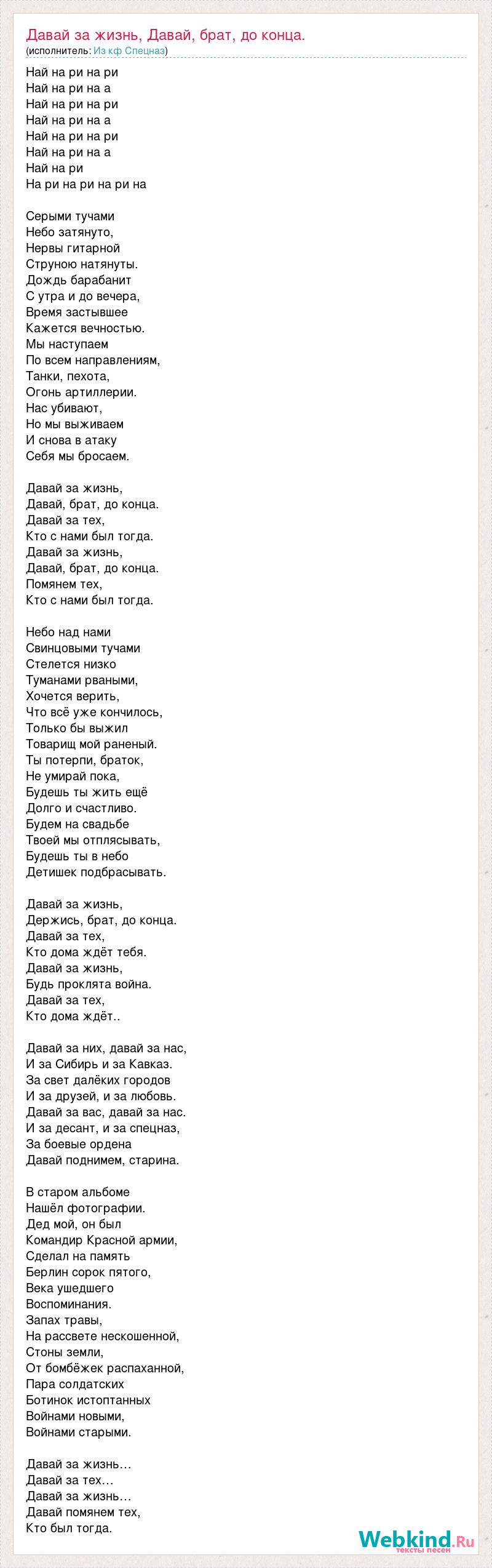Най на ри на ри Най на ри на а Най на ри на ри Най на ри на а Най на ри на ри Най на ри на а Най на ри На ри на ри на ри на Серыми тучами Небо затянуто, Нервы гитарной Струною натянуты. Дождь барабанит С утра и до вечера, Время застывшее Кажется вечностью. Мы наступаем По всем направлениям, Танки, пехота, Огонь артиллерии. Нас убивают, Но мы выживаем И снова в атаку Себя мы бросаем. Давай за жизнь, Давай, брат, до конца. Давай за тех, Кто с нами был тогда. Давай за жизнь, Давай, брат, до конца. Помянем тех, Кто с нами был тогда. Небо над нами Свинцовыми тучами Стелется низко Туманами рваными, Хочется верить, Что всё уже кончилось, Только бы выжил Товарищ мой раненый. Ты потерпи, браток, Не умирай пока, Будешь ты жить ещё Долго и счастливо. Будем на свадьбе Твоей мы отплясывать, Будешь ты в небо Детишек подбрасывать. Давай за жизнь, Держись, брат, до конца. Давай за тех, Кто дома ждёт тебя. Давай за жизнь, Будь проклята война. Давай за тех, Кто дома ждёт.. Давай за них, давай за нас, И за Сибирь и за Кавказ. За свет далёких городов И за друзей, и за любовь. Давай за вас, давай за нас. И за десант, и за спецназ, За боевые ордена Давай поднимем, старина. В старом альбоме Нашёл фотографии. Дед мой, он был Командир Красной армии, Сделал на память Берлин сорок пятого, Века ушедшего Воспоминания. Запах травы, На рассвете нескошенной, Стоны земли, От бомбёжек распаханной, Пара солдатских Ботинок истоптанных Войнами новыми, Войнами старыми. Давай за жизнь… Давай за тех… Давай за жизнь… Давай помянем тех, Кто был тогда.