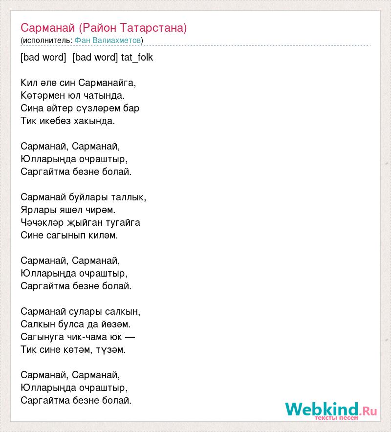 [bad word] [bad word] tat_folk Кил әле син Сарманайга, Көтәрмен юл чатында. Сиңа әйтер сүзләрем бар Тик икебез хакында. Сарманай, Сарманай, Юлларыңда очраштыр, Саргайтма безне болай. Сарманай буйлары таллык, Ярлары яшел чирәм. Чәчәкләр җыйган тугайга Сине сагынып киләм. Сарманай, Сарманай, Юлларыңда очраштыр, Саргайтма безне болай. Сарманай сулары салкын, Салкын булса да йөзәм. Сагынуга чик-чама юк — Тик сине көтәм, түзәм. Сарманай, Сарманай, Юлларыңда очраштыр, Саргайтма безне болай.
