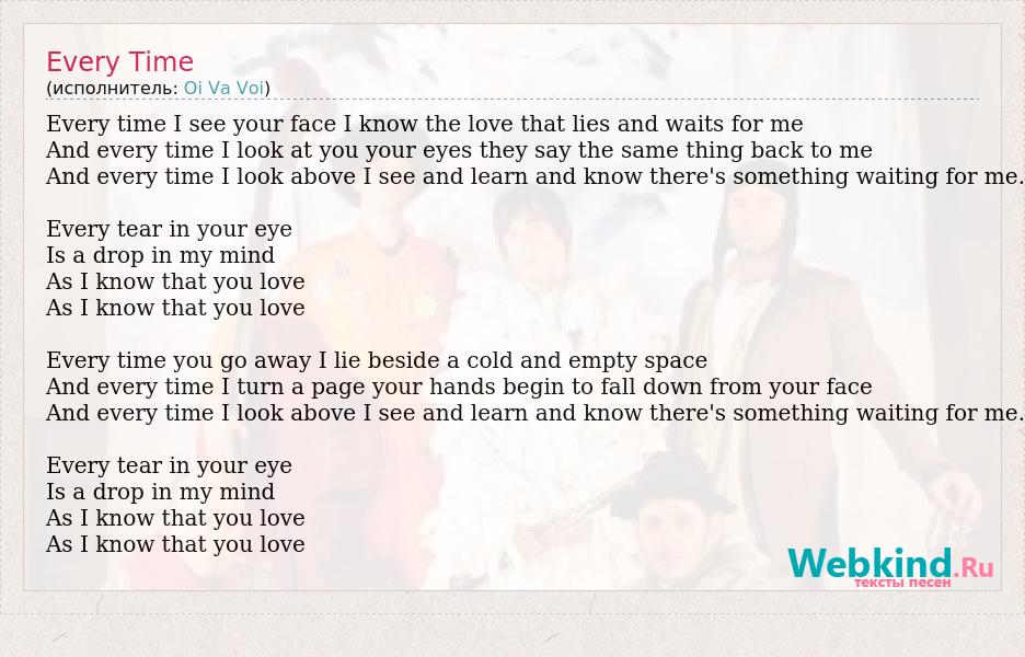 Every time I see your face I know the love that lies and waits for me And every time I look at you your eyes they say the same thing back to me And every time I look above I see and learn and know there's something waiting for me. Every tear in your eye Is a drop in my mind As I know that you love As I know that you love Every time you go away I lie beside a cold and empty space And every time I turn a page your hands begin to fall down from your face And every time I look above I see and learn and know there's something waiting for me. Every tear in your eye Is a drop in my mind As I know that you love As I know that you love