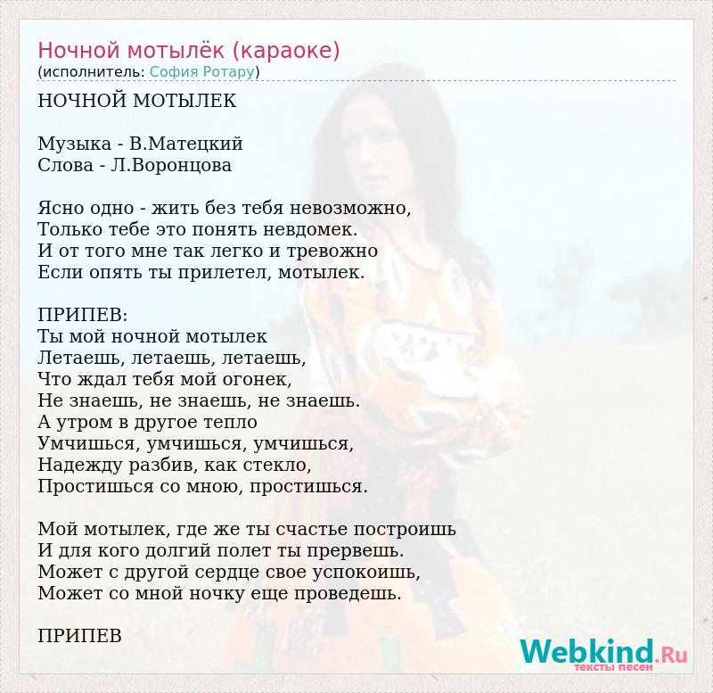 НОЧНОЙ МОТЫЛЕК Музыка - В.Матецкий Слова - Л.Воронцова Ясно одно - жить без тебя невозможно, Только тебе это понять невдомек. И от того мне так легко и тревожно Если опять ты прилетел, мотылек. ПРИПЕВ: Ты мой ночной мотылек Летаешь, летаешь, летаешь, Что ждал тебя мой огонек, Не знаешь, не знаешь, не знаешь. А утром в другое тепло Умчишься, умчишься, умчишься, Надежду разбив, как стекло, Простишься со мною, простишься. Мой мотылек, где же ты счастье построишь И для кого долгий полет ты прервешь. Может с другой сердце свое успокоишь, Может со мной ночку еще проведешь. ПРИПЕВ