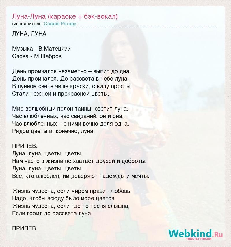 ЛУНА, ЛУНА Музыка - В.Матецкий Слова - М.Шабров День промчался незаметно – выпит до дна. День промчался. До рассвета в небе луна. В лунном свете чище краски, с виду просты Стали нежней и прекрасней цветы. Мир волшебный полон тайны, светит луна. Час влюбленных, час свиданий, он и она. Час влюбленных – с ними вечно доля одна, Рядом цветы и, конечно, луна. ПРИПЕВ: Луна, луна, цветы, цветы. Нам часто в жизни не хватает друзей и доброты. Луна, луна, цветы, цветы. Все, кто влюблен, им доверяют надежды и мечты. Жизнь чудесна, если миром правит любовь. Надо, чтобы всюду было море цветов. Жизнь чудесна, если где-то песня слышна, Если горит до рассвета луна. ПРИПЕВ