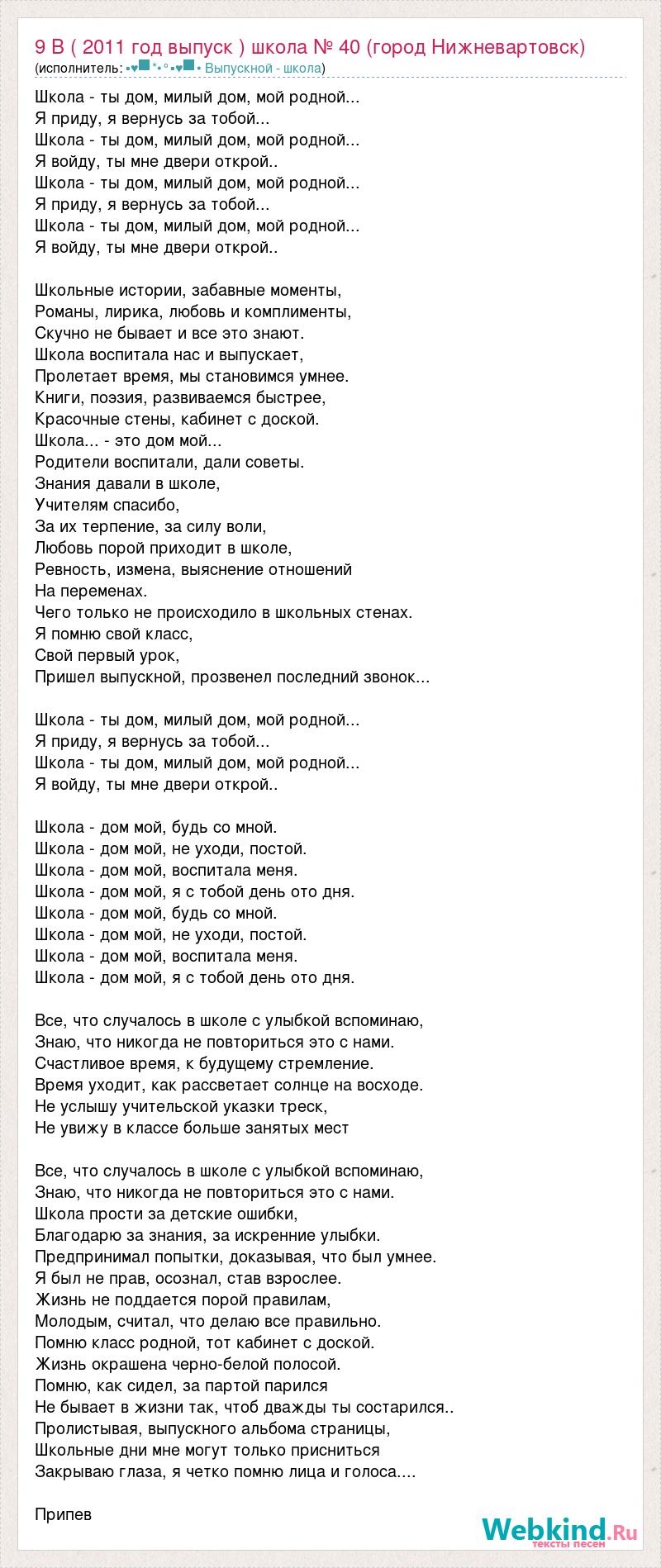 Школа - ты дом, милый дом, мой родной... Я приду, я вернусь за тобой... Школа - ты дом, милый дом, мой родной... Я войду, ты мне двери открой.. Школа - ты дом, милый дом, мой родной... Я приду, я вернусь за тобой... Школа - ты дом, милый дом, мой родной... Я войду, ты мне двери открой.. Школьные истории, забавные моменты, Романы, лирика, любовь и комплименты, Скучно не бывает и все это знают. Школа воспитала нас и выпускает, Пролетает время, мы становимся умнее. Книги, поэзия, развиваемся быстрее, Красочные стены, кабинет с доской. Школа... - это дом мой... Родители воспитали, дали советы. Знания давали в школе, Учителям спасибо, За их терпение, за силу воли, Любовь порой приходит в школе, Ревность, измена, выяснение отношений На переменах. Чего только не происходило в школьных стенах. Я помню свой класс, Свой первый урок, Пришел выпускной, прозвенел последний звонок... Школа - ты дом, милый дом, мой родной... Я приду, я вернусь за тобой... Школа - ты дом, милый дом, мой родной... Я войду, ты мне двери открой.. Школа - дом мой, будь со мной. Школа - дом мой, не уходи, постой. Школа - дом мой, воспитала меня. Школа - дом мой, я с тобой день ото дня. Школа - дом мой, будь со мной. Школа - дом мой, не уходи, постой. Школа - дом мой, воспитала меня. Школа - дом мой, я с тобой день ото дня. Все, что случалось в школе с улыбкой вспоминаю, Знаю, что никогда не повториться это с нами. Счастливое время, к будущему стремление. Время уходит, как рассветает солнце на восходе. Не услышу учительской указки треск, Не увижу в классе больше занятых мест Все, что случалось в школе с улыбкой вспоминаю, Знаю, что никогда не повториться это с нами. Школа прости за детские ошибки, Благодарю за знания, за искренние улыбки. Предпринимал попытки, доказывая, что был умнее. Я был не прав, осознал, став взрослее. Жизнь не поддается порой правилам, Молодым, считал, что делаю все правильно. Помню класс родной, тот кабинет с доской. Жизнь окрашена черно-белой полосой. Помню, как сидел, за партой парился Не бывает в жизни так, чтоб дважды ты состарился.. Пролистывая, выпускного альбома страницы, Школьные дни мне могут только присниться Закрываю глаза, я четко помню лица и голоса.... Припев