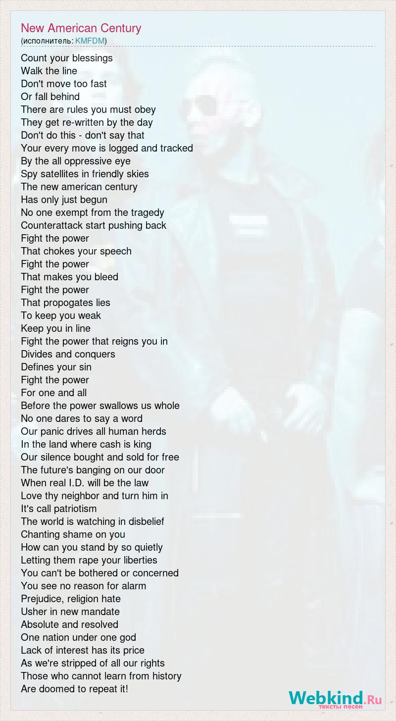 Count your blessings Walk the line Don't move too fast Or fall behind There are rules you must obey They get re-written by the day Don't do this - don't say that Your every move is logged and tracked By the all oppressive eye Spy satellites in friendly skies The new american century Has only just begun No one exempt from the tragedy Counterattack start pushing back Fight the power That chokes your speech Fight the power That makes you bleed Fight the power That propogates lies To keep you weak Keep you in line Fight the power that reigns you in Divides and conquers Defines your sin Fight the power For one and all Before the power swallows us whole No one dares to say a word Our panic drives all human herds In the land where cash is king Our silence bought and sold for free The future's banging on our door When real I.D. will be the law Love thy neighbor and turn him in It's call patriotism The world is watching in disbelief Chanting shame on you How can you stand by so quietly Letting them rape your liberties You can't be bothered or concerned You see no reason for alarm Prejudice, religion hate Usher in new mandate Absolute and resolved One nation under one god Lack of interest has its price As we're stripped of all our rights Those who cannot learn from history Are doomed to repeat it!