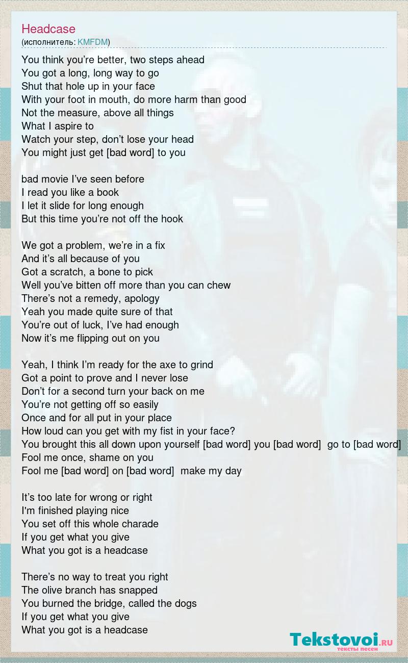 You think you’re better, two steps ahead You got a long, long way to go Shut that hole up in your face With your foot in mouth, do more harm than good Not the measure, above all things What I aspire to Watch your step, don’t lose your head You might just get what’s coming to you bad movie I’ve seen before I read you like a book I let it slide for long enough But this time you’re not off the hook We got a problem, we’re in a fix And it’s all because of you Got a scratch, a bone to pick Well you’ve bitten off more than you can chew There’s not a remedy, apology Yeah you made quite sure of that You’re out of luck, I’ve had enough Now it’s me flipping out on you Yeah, I think I’m ready for the axe to grind Got a point to prove and I never lose Don’t for a second turn your back on me You’re not getting off so easily Once and for all put in your place How loud can you get with my fist in your face? You brought this all down upon yourself [bad word] you [bad word] go to hell Fool me once, shame on you Fool me twice Come on [bad word] make my day It’s too late for wrong or right I'm finished playing nice You set off this whole charade If you get what you give What you got is a headcase There’s no way to treat you right The olive branch has snapped You burned the bridge, called the dogs If you get what you give What you got is a headcase