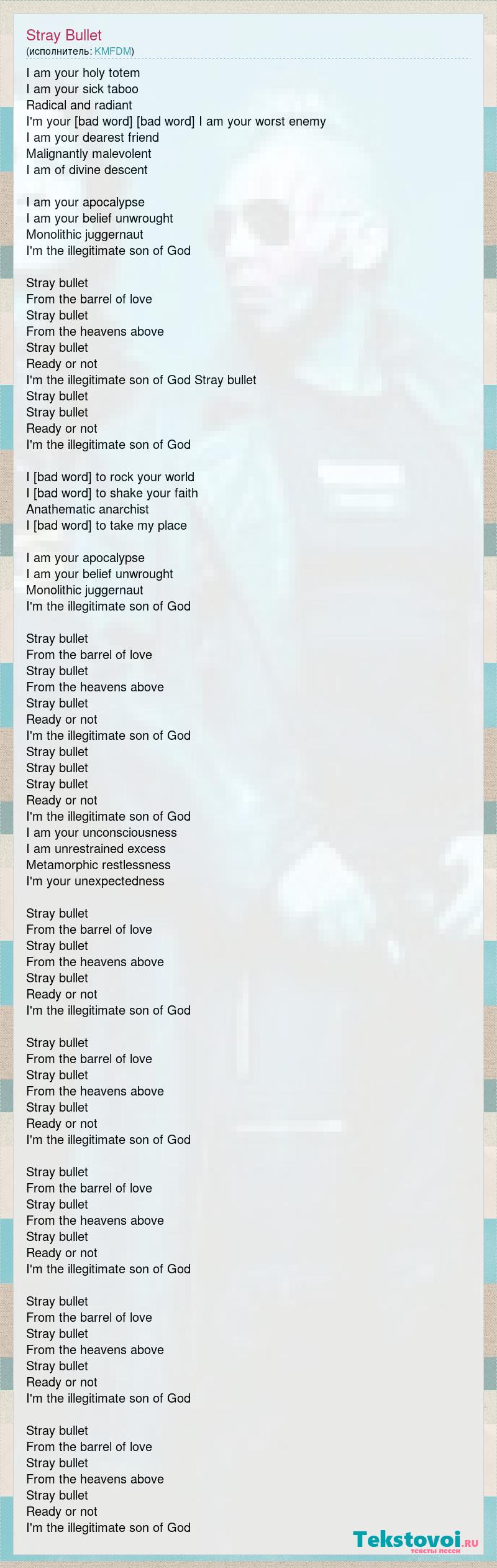 I am your holy totem I am your sick taboo Radical and radiant I'm your nightmare coming true I am your worst enemy I am your dearest friend Malignantly malevolent I am of divine descent I am your apocalypse I am your belief unwrought Monolithic juggernaut I'm the illegitimate son of God Stray bullet From the barrel of love Stray bullet From the heavens above Stray bullet Ready or not I'm the illegitimate son of God Stray bullet Stray bullet Stray bullet Ready or not I'm the illegitimate son of God I have come to rock your world I have come to shake your faith Anathematic anarchist I have come to take my place I am your apocalypse I am your belief unwrought Monolithic juggernaut I'm the illegitimate son of God Stray bullet From the barrel of love Stray bullet From the heavens above Stray bullet Ready or not I'm the illegitimate son of God Stray bullet Stray bullet Stray bullet Ready or not I'm the illegitimate son of God I am your unconsciousness I am unrestrained excess Metamorphic restlessness I'm your unexpectedness Stray bullet From the barrel of love Stray bullet From the heavens above Stray bullet Ready or not I'm the illegitimate son of God Stray bullet From the barrel of love Stray bullet From the heavens above Stray bullet Ready or not I'm the illegitimate son of God Stray bullet From the barrel of love Stray bullet From the heavens above Stray bullet Ready or not I'm the illegitimate son of God Stray bullet From the barrel of love Stray bullet From the heavens above Stray bullet Ready or not I'm the illegitimate son of God Stray bullet From the barrel of love Stray bullet From the heavens above Stray bullet Ready or not I'm the illegitimate son of God