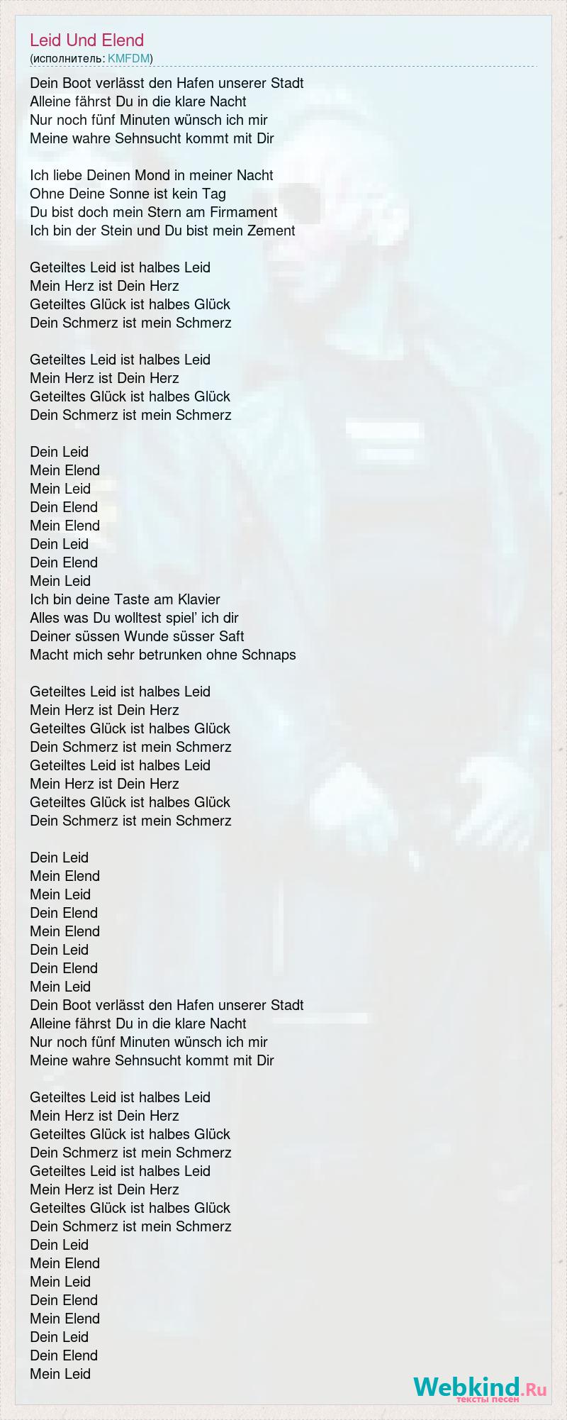 Dein Boot verlässt den Hafen unserer Stadt Alleine fährst Du in die klare Nacht Nur noch fünf Minuten wünsch ich mir Meine wahre Sehnsucht kommt mit Dir Ich liebe Deinen Mond in meiner Nacht Ohne Deine Sonne ist kein Tag Du bist doch mein Stern am Firmament Ich bin der Stein und Du bist mein Zement Geteiltes Leid ist halbes Leid Mein Herz ist Dein Herz Geteiltes Glück ist halbes Glück Dein Schmerz ist mein Schmerz Geteiltes Leid ist halbes Leid Mein Herz ist Dein Herz Geteiltes Glück ist halbes Glück Dein Schmerz ist mein Schmerz Dein Leid Mein Elend Mein Leid Dein Elend Mein Elend Dein Leid Dein Elend Mein Leid Ich bin deine Taste am Klavier Alles was Du wolltest spiel’ ich dir Deiner süssen Wunde süsser Saft Macht mich sehr betrunken ohne Schnaps Geteiltes Leid ist halbes Leid Mein Herz ist Dein Herz Geteiltes Glück ist halbes Glück Dein Schmerz ist mein Schmerz Geteiltes Leid ist halbes Leid Mein Herz ist Dein Herz Geteiltes Glück ist halbes Glück Dein Schmerz ist mein Schmerz Dein Leid Mein Elend Mein Leid Dein Elend Mein Elend Dein Leid Dein Elend Mein Leid Dein Boot verlässt den Hafen unserer Stadt Alleine fährst Du in die klare Nacht Nur noch fünf Minuten wünsch ich mir Meine wahre Sehnsucht kommt mit Dir Geteiltes Leid ist halbes Leid Mein Herz ist Dein Herz Geteiltes Glück ist halbes Glück Dein Schmerz ist mein Schmerz Geteiltes Leid ist halbes Leid Mein Herz ist Dein Herz Geteiltes Glück ist halbes Glück Dein Schmerz ist mein Schmerz Dein Leid Mein Elend Mein Leid Dein Elend Mein Elend Dein Leid Dein Elend Mein Leid