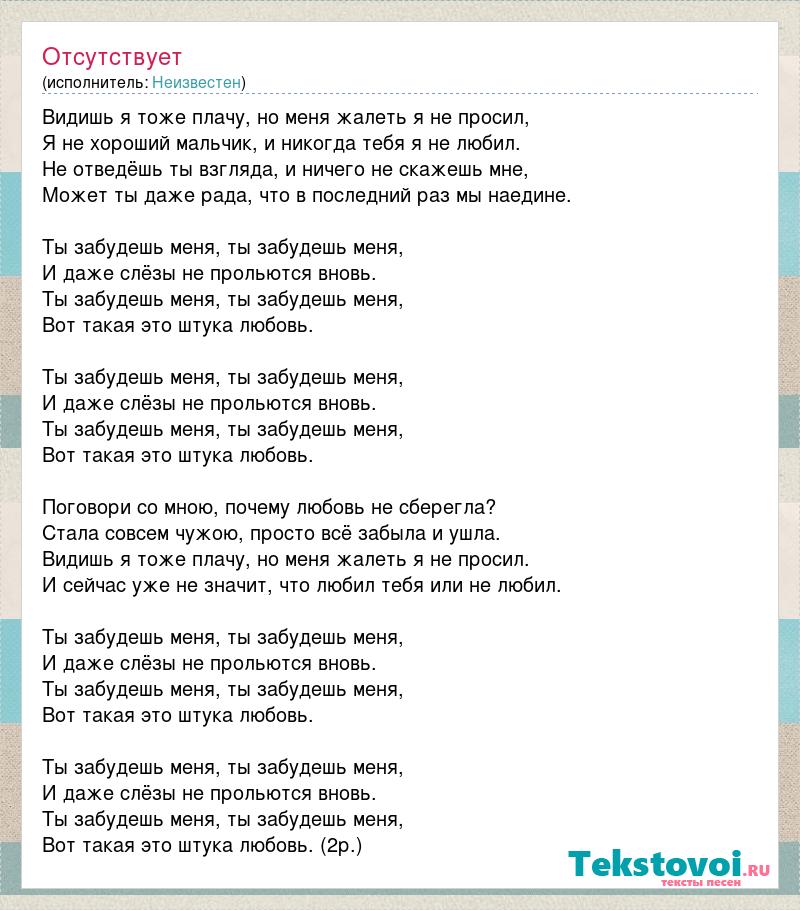 Видишь я тоже плачу, но меня жалеть я не просил, Я не хороший мальчик, и никогда тебя я не любил. Не отведёшь ты взгляда, и ничего не скажешь мне, Может ты даже рада, что в последний раз мы наедине. Ты забудешь меня, ты забудешь меня, И даже слёзы не прольются вновь. Ты забудешь меня, ты забудешь меня, Вот такая это штука любовь. Ты забудешь меня, ты забудешь меня, И даже слёзы не прольются вновь. Ты забудешь меня, ты забудешь меня, Вот такая это штука любовь. Поговори со мною, почему любовь не сберегла? Стала совсем чужою, просто всё забыла и ушла. Видишь я тоже плачу, но меня жалеть я не просил. И сейчас уже не значит, что любил тебя или не любил. Ты забудешь меня, ты забудешь меня, И даже слёзы не прольются вновь. Ты забудешь меня, ты забудешь меня, Вот такая это штука любовь. Ты забудешь меня, ты забудешь меня, И даже слёзы не прольются вновь. Ты забудешь меня, ты забудешь меня, Вот такая это штука любовь. (2р.)