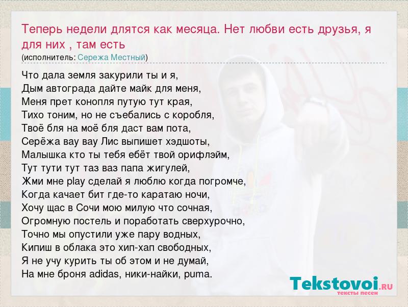Главная→Исполнители→Сережа Местный→Теперь недели длятся как месяца. Нет любви есть друзья, я для них , там есть