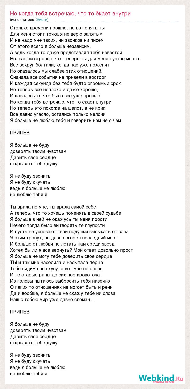 Столько времени прошло, но вот опять ты Для меня стоит точка я не верю запятым И не надо мне твоих, ни звонков ни писем От этого всего я больше независим. А ведь когда то даже представлял тебя невестой Но, как ни странно, что теперь ты для меня пустое место. Все вокруг болтали, когда нас уже поженят Но оказалось мы слабее этих отношений. Сначала все события не привели в восторг И каждая секунда без тебя будто огромный срок Но теперь все неплохо и даже хорошо, И казалось то что было все уже прошло Но когда тебя встречаю, что то ёкает внутри Но теперь это похоже на шепот, а не крик Все давно угасло, остались только мелочи Я больше не люблю тебя и говорить нам не о чем ПРИПЕВ Я больше не буду доверять твоим чувствам Дарить свое сердце открывать тебе душу Я не буду звонить Я не буду скучать ведь я больше не люблю не люблю тебя я Ты врала не мне, ты врала самой себе А теперь, что то хочешь поменять в своей судьбе Я больше в ней не окажусь ты меня прости Нечего тогда было вытворять те глупости И пусть не успевают твои подушки высыхать от слез Я этим тронут, но давно сгорел последний мост И больше от любви не летать нам среди звезд Хотел бы ли я все вернуть? Мой ответ довольно прост Я больше не могу тебе доверить свое сердце ТЫ и так мне насолила и насыпала перца Тебе видимо по вкусу, а вот мне не очень И те старые раны до сих пор кровоточат Из головы пытаюсь выбросить тебя навечно О каких то отношениях не может быть и речи Да и вообще, я больше не скажу тебе ни слова Наш с тобою мир уже давно сломан... ПРИПЕВ Я больше не буду доверять твоим чувствам Дарить свое сердце открывать тебе душу Я не буду звонить Я не буду скучать ведь я больше не люблю не люблю тебя я