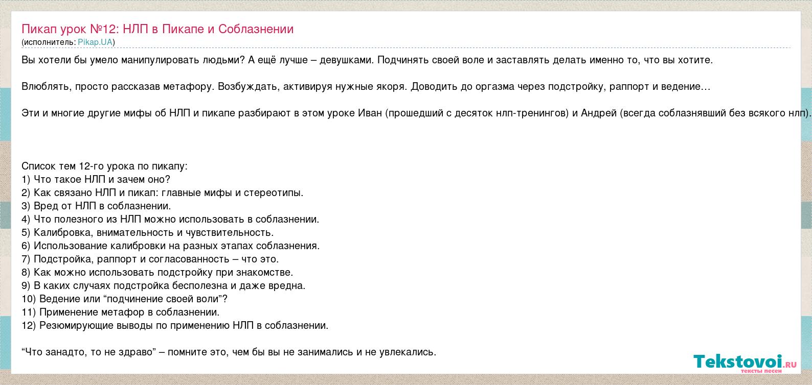 А как ты думаешь, о чем песня "Пикап урок №12: НЛП в Пикапе и Соблазнении" ?