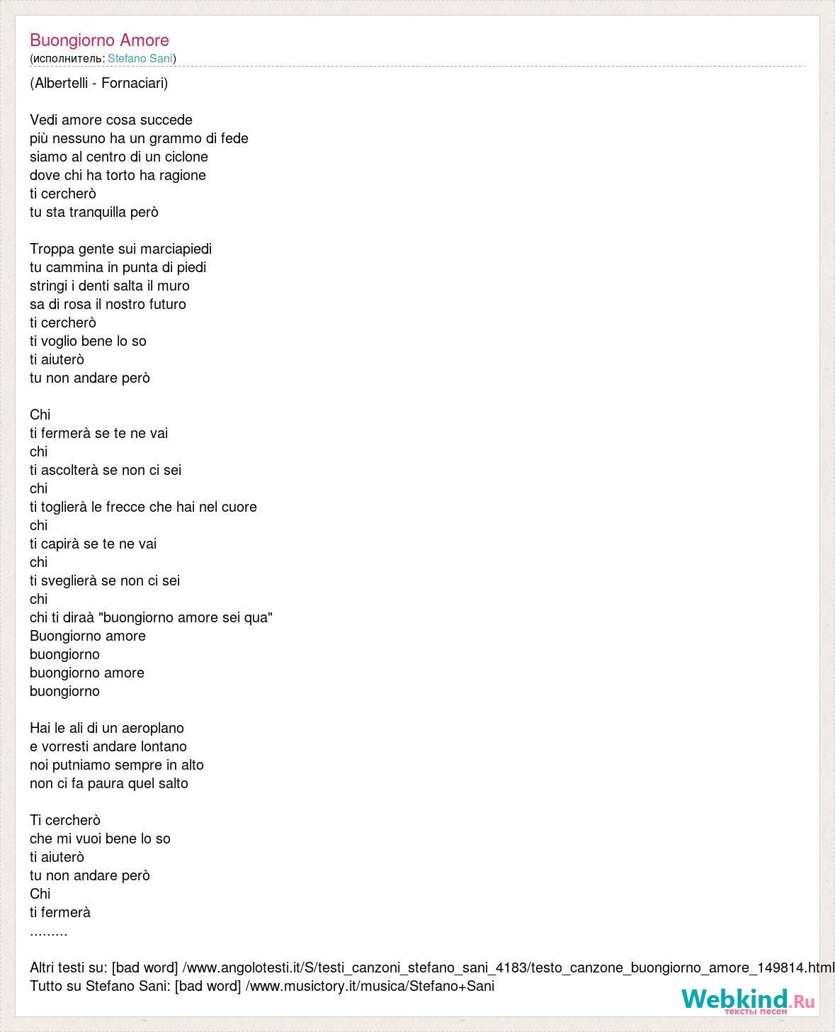 (Albertelli - Fornaciari) Vedi amore cosa succede più nessuno ha un grammo di fede siamo al centro di un ciclone dove chi ha torto ha ragione ti cercherò tu sta tranquilla però Troppa gente sui marciapiedi tu cammina in punta di piedi stringi i denti salta il muro sa di rosa il nostro futuro ti cercherò ti voglio bene lo so ti aiuterò tu non andare però Chi ti fermerà se te ne vai chi ti ascolterà se non ci sei chi ti toglierà le frecce che hai nel cuore chi ti capirà se te ne vai chi ti sveglierà se non ci sei chi chi ti diraà "buongiorno amore sei qua" Buongiorno amore buongiorno buongiorno amore buongiorno Hai le ali di un aeroplano e vorresti andare lontano noi putniamo sempre in alto non ci fa paura quel salto Ti cercherò che mi vuoi bene lo so ti aiuterò tu non andare però Chi ti fermerà ......... Altri testi su: [bad word] /www.angolotesti.it/S/testi_canzoni_stefano_sani_4183/testo_canzone_buongiorno_amore_149814.html Tutto su Stefano Sani: [bad word] /www.musictory.it/musica/Stefano+Sani
