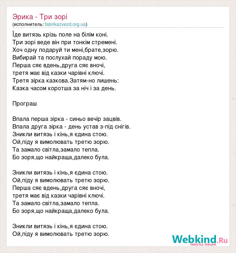 Їде витязь крізь поле на білім коні. Три зорі веде він при тонкім стремені. Хоч одну подаруй ти мені,брате,зорю. Вибирай та послухай пораду мою. Перша сяє вдень,друга сяє вночі, третя має від казки чарівні ключі. Третя зірка казкова.Затям-но лишень: Казка часом коротша за ніч і за день. Програш Впала перша зірка - синьо вечір зацвів. Впала друга зірка - день устав з-під снігів. Зникли витязь і кінь,я єдина стою. Ой,піду я вимолювать третю зорю. Та замало світла,замало тепла. Бо зоря,що найкраща,далеко була. Зникли витязь і кінь,я єдина стою. Ой,піду я вимолювать третю зорю. Перша сяє вдень,друга сяє вночі, третя має від казки чарівні ключі. Та замало світла,замало тепла. Бо зоря,що найкраща,далеко була. Зникли витязь і кінь,я єдина стою. Ой,піду я вимолювать третю зорю.