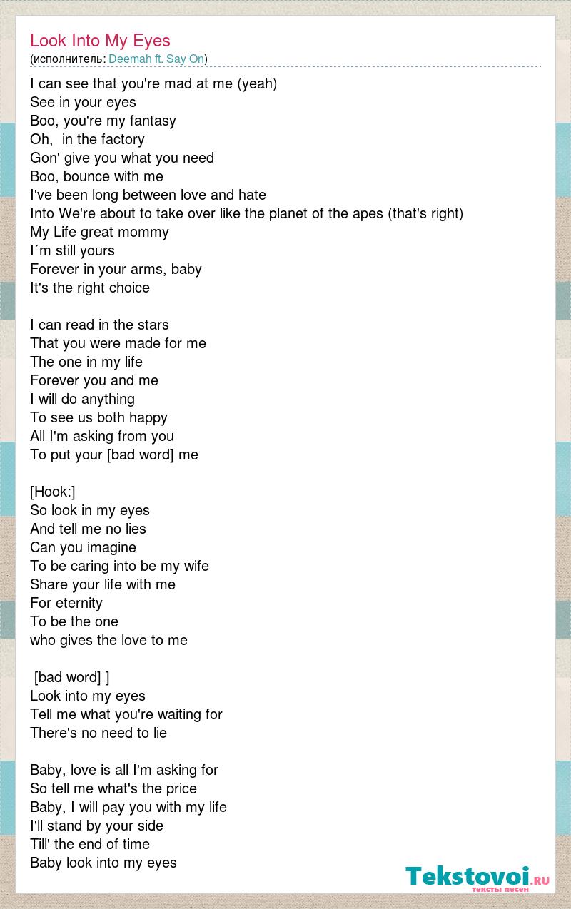 I can see that you're mad at me (yeah) See in your eyes Boo, you're my fantasy Oh, in the factory Gon' give you what you need Boo, bounce with me I've been long between love and hate Into We're about to take over like the planet of the apes (that's right) My Life great mommy I´m still yours Forever in your arms, baby It's the right choice I can read in the stars That you were made for me The one in my life Forever you and me I will do anything To see us both happy All I'm asking from you To put your [bad word] me [Hook:] So look in my eyes And tell me no lies Can you imagine To be caring into be my wife Share your life with me For eternity To be the one who gives the love to me [bad word] ] Look into my eyes Tell me what you're waiting for There's no need to lie Baby, love is all I'm asking for So tell me what's the price Baby, I will pay you with my life I'll stand by your side Till' the end of time Baby look into my eyes
