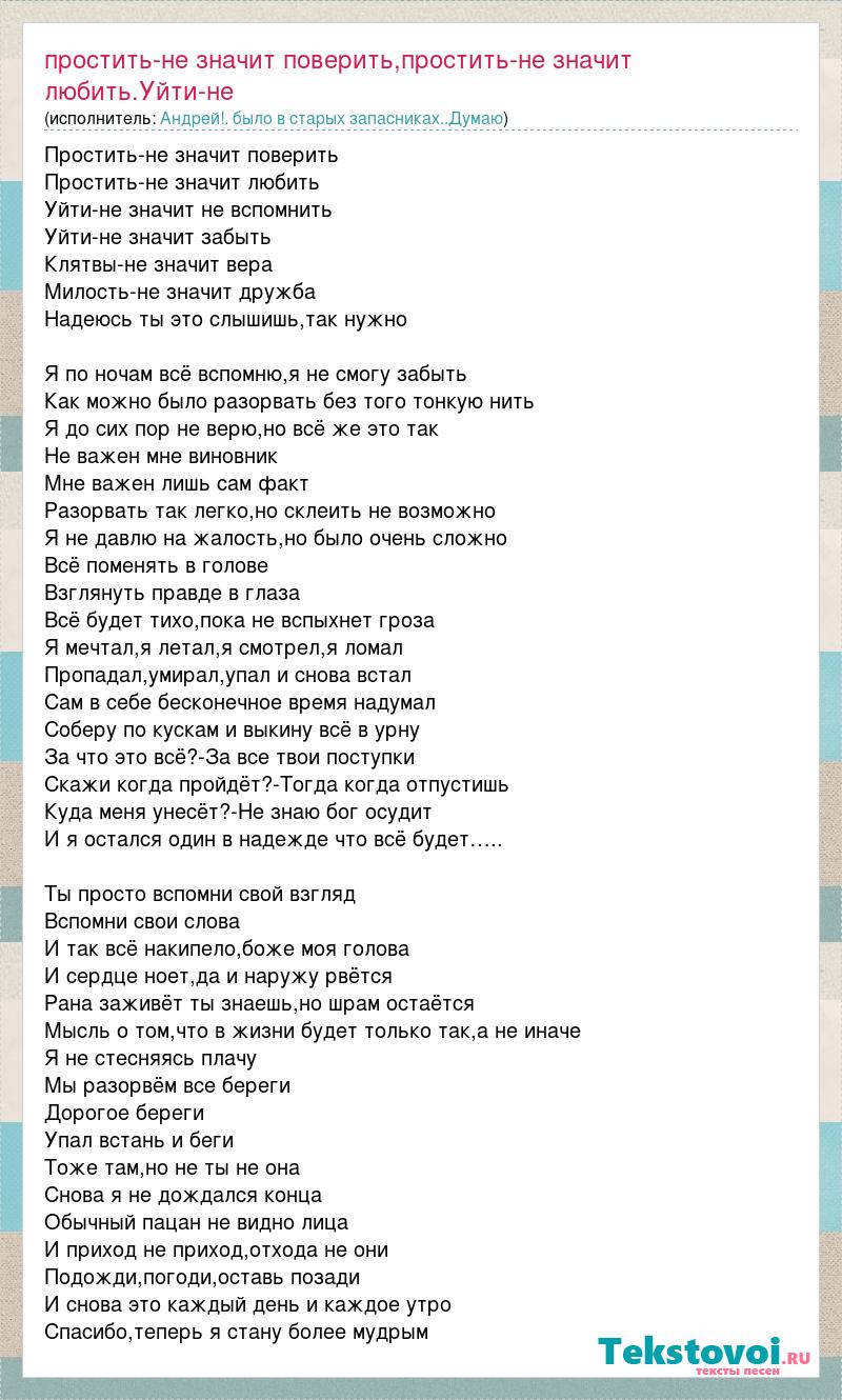 Главная→Исполнители→Андрей!. было в старых запасниках..Думаю сейчас можно.её выложить.. она просто нравиться мне. Кому нода тот услышит. Значи→Простить-не значит поверить,простить-не значит любить.Уйти-не значит не в
