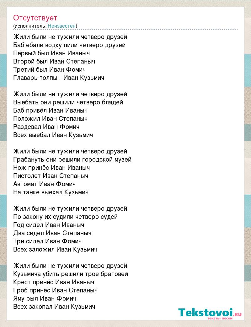 Жили были не тужили четверо друзей Баб ебали водку пили четверо друзей Первый был Иван Иваныч Второй был Иван Степаныч Третий был Иван Фомич Главарь толпы - Иван Кузьмич Жили были не тужили четверо друзей Выебать они решили четверо блядей Баб привёл Иван Иваныч Положил Иван Степаныч Раздевал Иван Фомич Всех выебал Иван Кузьмич Жили были не тужили четверо друзей Грабануть они решили городской музей Нож принёс Иван Иваныч Пистолет Иван Степаныч Автомат Иван Фомич На танке выехал Кузьмич Жили были не тужили четверо друзей По закону их судили четверо судей Год сидел Иван Иваныч Два сидел Иван Степаныч Три сидел Иван Фомич Всех заложил Иван Кузьмич Жили были не тужили четверо друзей Кузьмича убить решили трое братовей Крест принёс Иван Иваныч Гроб принёс Иван Степаныч Яму рыл Иван Фомич Всех закопал Иван Кузьмич