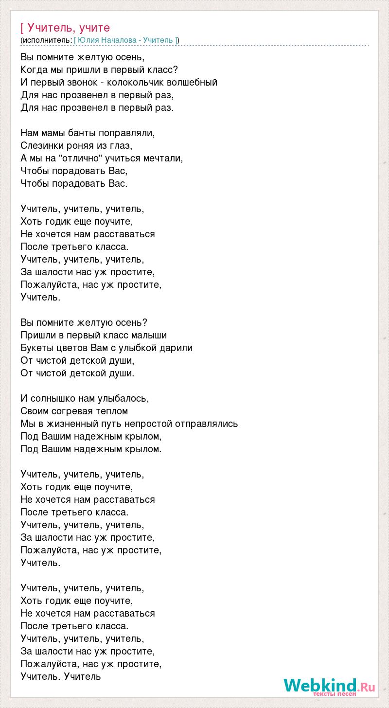 Вы помните желтую осень, Когда мы пришли в первый класс? И первый звонок - колокольчик волшебный Для нас прозвенел в первый раз, Для нас прозвенел в первый раз. Нам мамы банты поправляли, Слезинки роняя из глаз, А мы на "отлично" учиться мечтали, Чтобы порадовать Вас, Чтобы порадовать Вас. Учитель, учитель, учитель, Хоть годик еще поучите, Не хочется нам расставаться После третьего класса. Учитель, учитель, учитель, За шалости нас уж простите, Пожалуйста, нас уж простите, Учитель. Вы помните желтую осень? Пришли в первый класс малыши Букеты цветов Вам с улыбкой дарили От чистой детской души, От чистой детской души. И солнышко нам улыбалось, Своим согревая теплом Мы в жизненный путь непростой отправлялись Под Вашим надежным крылом, Под Вашим надежным крылом. Учитель, учитель, учитель, Хоть годик еще поучите, Не хочется нам расставаться После третьего класса. Учитель, учитель, учитель, За шалости нас уж простите, Пожалуйста, нас уж простите, Учитель. Учитель, учитель, учитель, Хоть годик еще поучите, Не хочется нам расставаться После третьего класса. Учитель, учитель, учитель, За шалости нас уж простите, Пожалуйста, нас уж простите, Учитель. Учитель