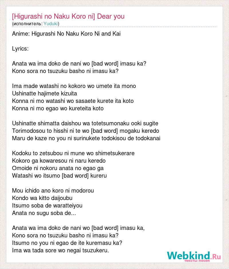Anime: Higurashi No Naku Koro Ni and Kai Lyrics: Anata wa ima doko de nani wo [bad word] imasu ka? Kono sora no tsuzuku basho ni imasu ka? Ima made watashi no kokoro wo umete ita mono Ushinatte hajimete kizuita Konna ni mo watashi wo sasaete kurete ita koto Konna ni mo egao wo kureteita koto Ushinatte shimatta daishou wa totetsumonaku ooki sugite Torimodosou to hisshi ni te wo [bad word] mogaku keredo Maru de kaze no you ni surinukete todokisou de todokanai Kodoku to zetsubou ni mune wo shimetsukerare Kokoro ga kowaresou ni naru keredo Omoide ni nokoru anata no egao ga Watashi wo itsumo [bad word] kureru Mou ichido ano koro ni modorou Kondo wa kitto daijoubu Itsumo soba de waratteiyou Anata no sugu soba de... Anata wa ima doko de nani wo [bad word] imasu ka, Kono sora no tsuzuku basho ni imasu ka? Itsumo no you ni egao de ite kuremasu ka? Ima wa tada sore wo negai tsuzukeru.