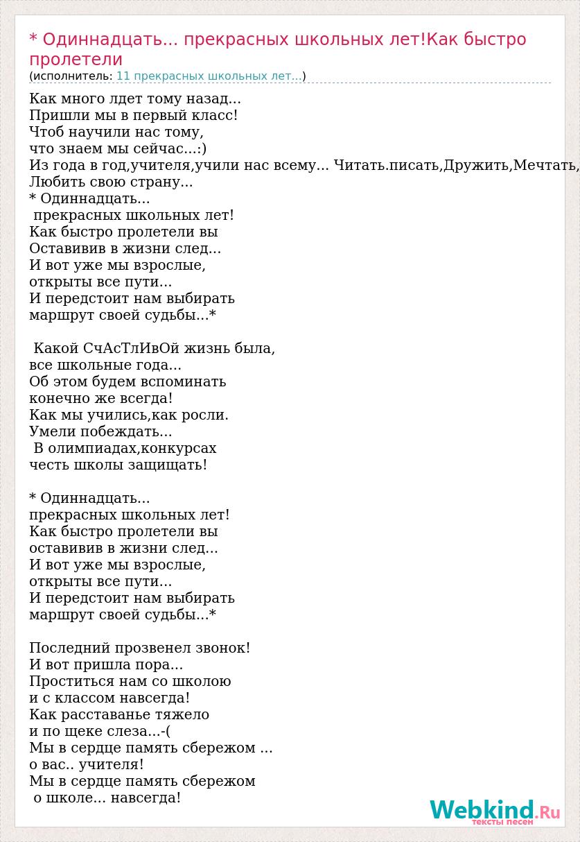 Как много лдет тому назад... Пришли мы в первый класс! Чтоб научили нас тому, что знаем мы сейчас...:) Из года в год,учителя,учили нас всему... Читать.писать,Дружить,Мечтать, Любить свою страну... * Одиннадцать... прекрасных школьных лет! Как быстро пролетели вы Оставивив в жизни след... И вот уже мы взрослые, открыты все пути... И передстоит нам выбирать маршрут своей судьбы...* Какой СчАсТлИвОй жизнь была, все школьные года... Об этом будем вспоминать конечно же всегда! Как мы учились,как росли. Умели побеждать... В олимпиадах,конкурсах честь школы защищать! * Одиннадцать... прекрасных школьных лет! Как быстро пролетели вы оставивив в жизни след... И вот уже мы взрослые, открыты все пути... И передстоит нам выбирать маршрут своей судьбы...* Последний прозвенел звонок! И вот пришла пора... Проститься нам со школою и с классом навсегда! Как расставанье тяжело и по щеке слеза...-( Мы в сердце память сбережом ... о вас.. учителя! Мы в сердце память сбережом о школе... навсегда!