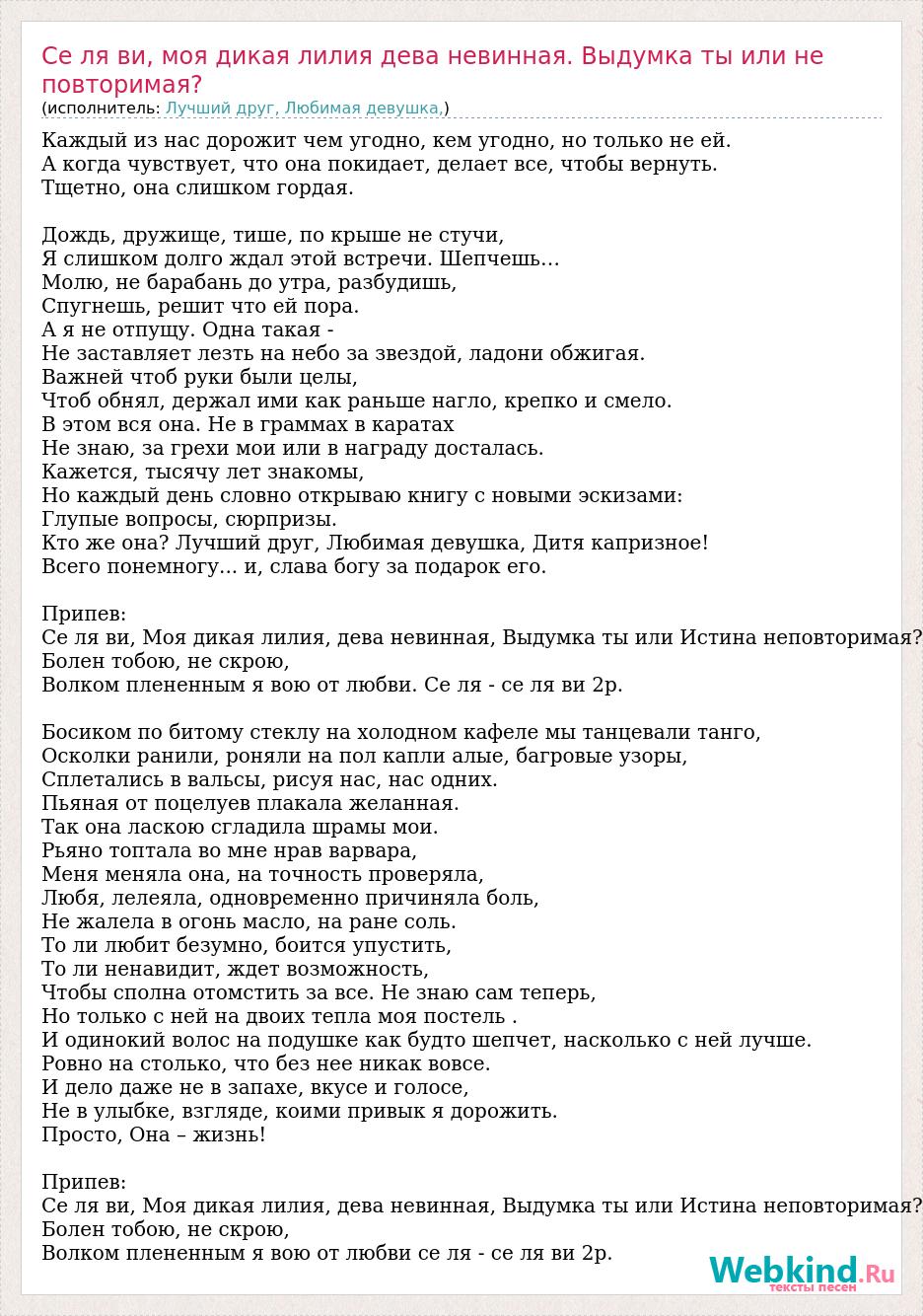Главная→Исполнители→Лучший друг, Любимая девушка,→Се ля ви, моя дикая лилия дева невинная. Выдумка ты или не повторимая?