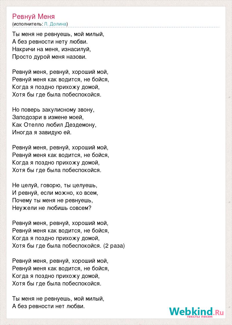 Ты меня не ревнуешь, мой милый, А без ревности нету любви. Накричи на меня, изнасилуй, Просто дурой меня назови. Ревнуй меня, ревнуй, хороший мой, Ревнуй меня как водится, не бойся, Когда я поздно прихожу домой, Хотя бы где была побеспокойся. Но поверь закулисному звону, Заподозри в измене моей, Как Отелло любил Дездемону, Иногда я завидую ей. Ревнуй меня, ревнуй, хороший мой, Ревнуй меня как водится, не бойся, Когда я поздно прихожу домой, Хотя бы где была побеспокойся. Не целуй, говорю, ты целуешь, И ревнуй, если можно, ко всем, Почему ты меня не ревнуешь, Неужели не любишь совсем? Ревнуй меня, ревнуй, хороший мой, Ревнуй меня как водится, не бойся, Когда я поздно прихожу домой, Хотя бы где была побеспокойся. (2 раза) Ревнуй меня, ревнуй, хороший мой, Ревнуй меня как водится, не бойся, Когда я поздно прихожу домой, Хотя бы где была побеспокойся. Ты меня не ревнуешь, мой милый, А без ревности нет любви.