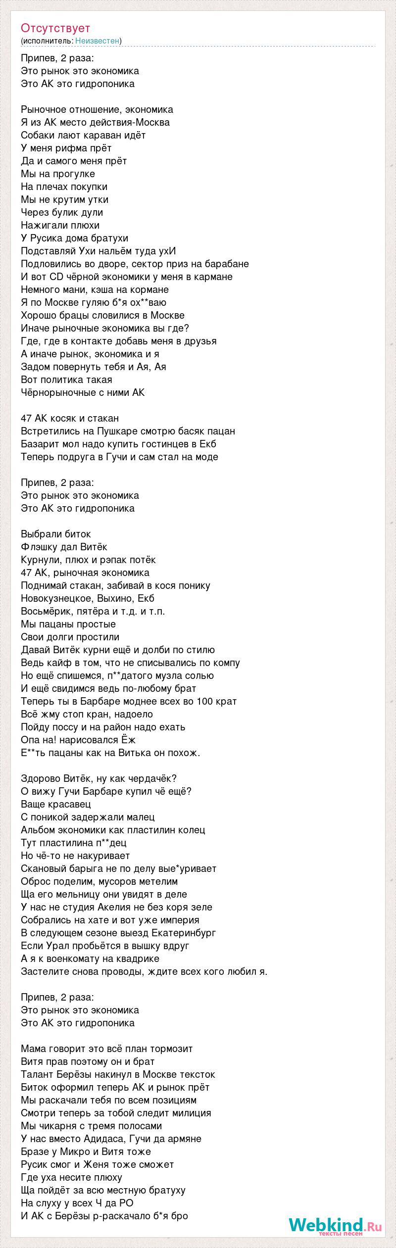 Припев, 2 раза: Это рынок это экономика Это АК это гидропоника Рыночное отношение, экономика Я из АК место действия-Москва Собаки лают караван идёт У меня рифма прёт Да и самого меня прёт Мы на прогулке На плечах покупки Мы не крутим утки Через булик дули Нажигали плюхи У Русика дома братухи Подставляй Ухи нальём туда ухИ Подловились во дворе, сектор приз на барабане И вот CD чёрной экономики у меня в кармане Немного мани, кэша на кормане Я по Москве гуляю б*я ох**ваю Хорошо брацы словилися в Москве Иначе рыночные экономика вы где? Где, где в контакте добавь меня в друзья А иначе рынок, экономика и я Задом повернуть тебя и Ая, Ая Вот политика такая Чёрнорыночные с ними АК 47 АК косяк и стакан Встретились на Пушкаре смотрю басяк пацан Базарит мол надо купить гостинцев в Екб Теперь подруга в Гучи и сам стал на моде Припев, 2 раза: Это рынок это экономика Это АК это гидропоника Выбрали биток Флэшку дал Витёк Курнули, плюх и рэпак потёк 47 АК, рыночная экономика Поднимай стакан, забивай в кося понику Новокузнецкое, Выхино, Екб Восьмёрик, пятёра и т.д. и т.п. Мы пацаны простые Свои долги простили Давай Витёк курни ещё и долби по стилю Ведь кайф в том, что не списывались по компу Но ещё спишемся, п**датого музла солью И ещё свидимся ведь по-любому брат Теперь ты в Барбаре моднее всех во 100 крат Всё жму стоп кран, надоело Пойду поссу и на район надо ехать Опа на! нарисовался Ёж Е**ть пацаны как на Витька он похож. Здорово Витёк, ну как чердачёк? О вижу Гучи Барбаре купил чё ещё? Ваще красавец С поникой задержали малец Альбом экономики как пластилин колец Тут пластилина п**дец Но чё-то не накуривает Скановый барыга не по делу вые*уривает Оброс поделим, мусоров метелим Ща его мельницу они увидят в деле У нас не студия Акелия не без коря зеле Собрались на хате и вот уже империя В следующем сезоне выезд Екатеринбург Если Урал пробьётся в вышку вдруг А я к военкомату на квадрике Застелите снова проводы, ждите всех кого любил я. Припев, 2 раза: Это рынок это экономика Это АК это гидропоника Мама говорит это всё план тормозит Витя прав поэтому он и брат Талант Берёзы накинул в Москве тексток Биток оформил теперь АК и рынок прёт Мы раскачали тебя по всем позициям Смотри теперь за тобой следит милиция Мы чикарня с тремя полосами У нас вместо Адидаса, Гучи да армяне Бразе у Микро и Витя тоже Русик смог и Женя тоже сможет Где уха несите плюху Ща пойдёт за всю местную братуху На слуху у всех Ч да РО И АК с Берёзы р-раскачало б*я бро