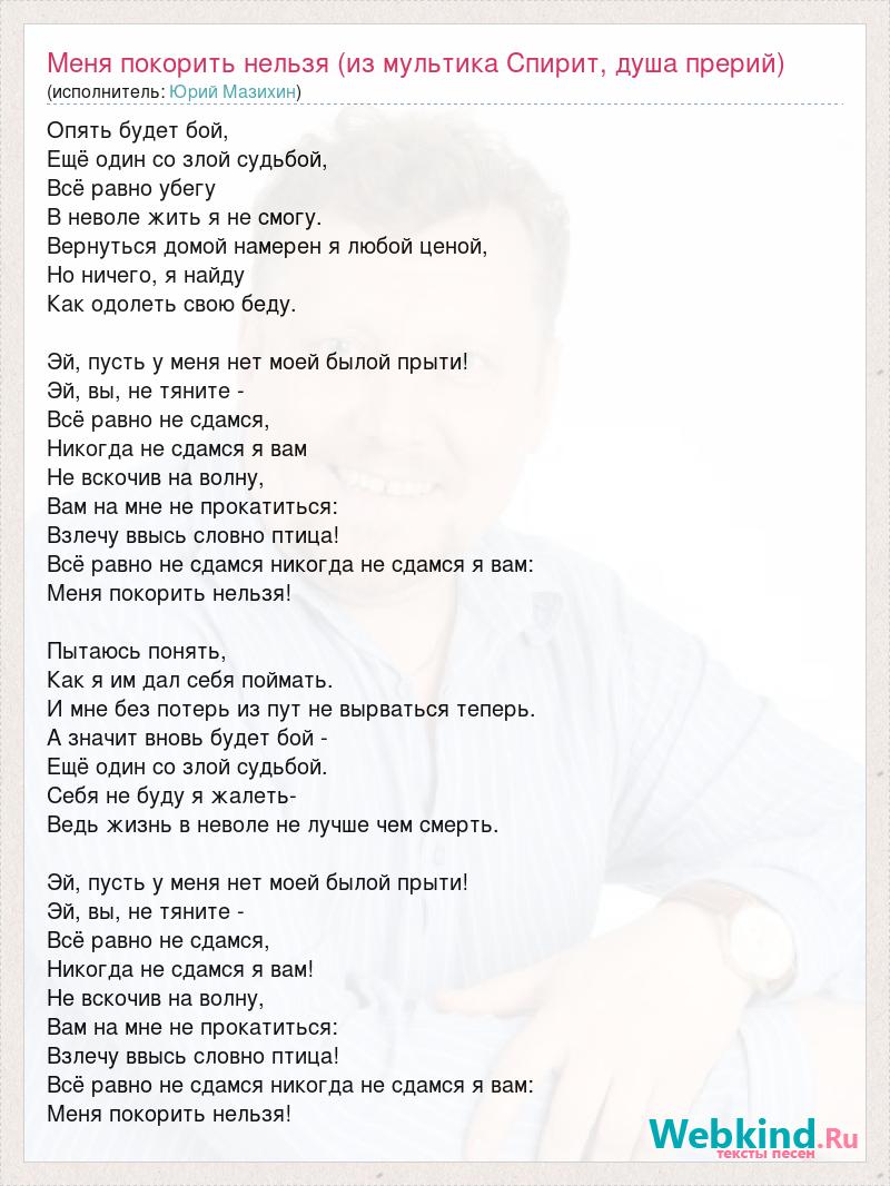 Опять будет бой, Ещё один со злой судьбой, Всё равно убегу В неволе жить я не смогу. Вернуться домой намерен я любой ценой, Но ничего, я найду Как одолеть свою беду. Эй, пусть у меня нет моей былой прыти! Эй, вы, не тяните - Всё равно не сдамся, Никогда не сдамся я вам Не вскочив на волну, Вам на мне не прокатиться: Взлечу ввысь словно птица! Всё равно не сдамся никогда не сдамся я вам: Меня покорить нельзя! Пытаюсь понять, Как я им дал себя поймать. И мне без потерь из пут не вырваться теперь. А значит вновь будет бой - Ещё один со злой судьбой. Себя не буду я жалеть- Ведь жизнь в неволе не лучше чем смерть. Эй, пусть у меня нет моей былой прыти! Эй, вы, не тяните - Всё равно не сдамся, Никогда не сдамся я вам! Не вскочив на волну, Вам на мне не прокатиться: Взлечу ввысь словно птица! Всё равно не сдамся никогда не сдамся я вам: Меня покорить нельзя!