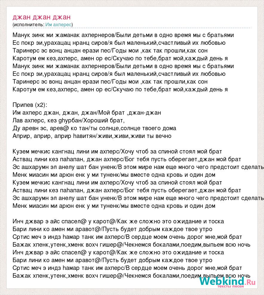 Манук эинк ми жаманак ахпернеров/Были детьми в одно время мы с братьями Ес покр эи,урахацац нранц сиров/я был маленький,счастливый их любовью Таринерс эс вонц анцан ерази пес/Годы мои ,как так прошли,как сон Каротум ем кез,ахперс, амен ор ес/Скучаю по тебе,брат мой,каждый день я Манук эинк ми жаманак ахпернеров/Были детьми в одно время мы с братьями Ес покр эи,урахацац нранц сиров/я был маленький,счастливый их любовью Таринерс эс вонц анцан ерази пес/Годы мои ,как так прошли,как сон Каротум ем кез,ахперс, амен ор ес/Скучаю по тебе,брат мой,каждый день я Припев (x2): Им ахперс джан, джан, джан/Мой брат ,джан-джан Лав ахперс, кез ghурбан/Хороший брат, Ду аревн эс, арев@ ко тан/ты солнце,солнце твоего дома Априр, априр, априр hавитян/живи,живи,живи ты вечно Кузем мечкис кангнац лини им ахперс/Хочу чтоб за спиной стоял мой брат Аствац лини кез паhапан, джан ахперс/Бог тебя пусть оберегает,джан мой брат Эс ашхарумн эл анелу шат бан уненк/В этом мире нам еще много чего предстоит сделать Менк миасин ми арюн енк у ми туненк/мы вместе одна кровь и один дом Кузем мечкис кангнац лини им ахперс/Хочу чтоб за спиной стоял мой брат Аствац лини кез паhапан, джан ахперс/Бог тебя пусть оберегает,джан мой брат Эс ашхарумн эл анелу шат бан уненк/В этом мире нам еще много чего предстоит сделать Менк миасин ми арюн енк у ми туненк/мы вместе одна кровь и один дом Инч джвар э айс спасел@ у карот@/Как же сложно это ожидание и тоска Бари лини ко амен ми аравот@/Пусть будет добрым каждое твое утро Сртис меч э индз hамар танк им ахперс/В сердце моем очень дорог мне,мой брат Бажак хпенк,утенк,хменк вохч гишер@/Чекнемся бокалами,поедим,выпьем всю ночь Инч джвар э айс спасел@ у карот@/Как же сложно это ожидание и тоска Бари лини ко амен ми аравот@/Пусть будет добрым каждое твое утро Сртис меч э индз hамар танк им ахперс/В сердце моем очень дорог мне,мой брат Бажак хпенк,утенк,хменк вохч гишер@/Чекнемся бокалами,поедим,выпьем всю ночь