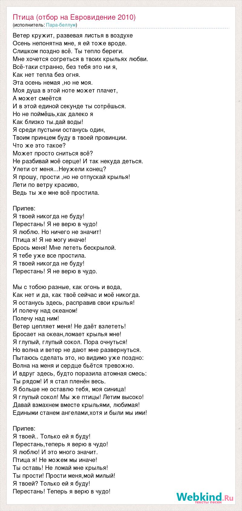 Ветер кружит, развевая листья в воздухе Осень непонятна мне, я ей тоже вроде. Слишком поздно всё. Ты тепло береги. Мне хочется согреться в твоих крыльях любви. Всё-таки странно, без тебя это ни я, Как нет тепла без огня. Эта осень немая ,но не моя. Моя душа в этой ноте может плачет, А может смеётся И в этой единой секунде ты сотрёшься. Но не поймёшь,как далеко я Как близко ты.дай воды! Я среди пустыни останусь один, Твоим принцем буду в твоей провинции. Что же это такое? Может просто сниться всё? Не разбивай моё серце! И так некуда деться. Улети от меня...Неужели конец? Я прошу, прости ,но не отпускай крылья! Лети по ветру красиво, Ведь ты же мне всё простила. Припев: Я твоей никогда не буду! Перестань! Я не верю в чудо! Я люблю. Но ничего не значит! Птица я! Я не могу иначе! Брось меня! Мне лететь бескрылой. Я тебе уже все простила. Я твоей никогда не буду! Перестань! Я не верю в чудо. Мы с тобою разные, как огонь и вода, Как нет и да, как твоё сейчас и моё никогда. Я останусь здесь, расправив свои крылья! И полечу над океаном! Полечу над ним! Ветер цепляет меня! Не даёт взлететь! Бросает на океан,ломает крылья мне! Я глупый, глупый сокол. Пора очнуться! Но волна и ветер не дают мне развернуться. Пытаюсь сделать это, но видимо уже поздно: Волна на меня и сердце бьётся тревожно. И вдруг здесь, будто поразила атомная смесь: Ты рядом! И я стал пленён весь. Я больше не оставлю тебя, моя синица! Я глупый сокол! Мы же птицы! Летим высоко! Давай взмахнем вместе крыльями, любимая! Едиными станем ангелами,хотя и были мы ими! Припев: Я твоей.. Только ей я буду! Перестань,теперь я верю в чудо! Я люблю! И это много значит. Птица я! Не можем мы иначе! Ты оставь! Не ломай мне крылья! Ты прости! Прости меня,мой милый! Я твоей? Только ей я буду! Перестань! Теперь я верю в чудо!