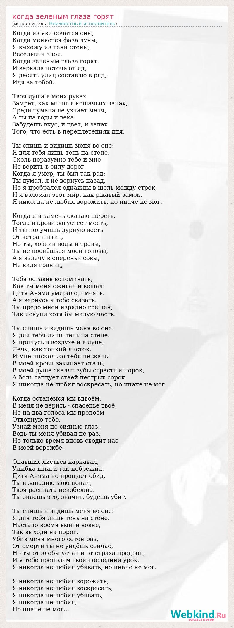 Когда из яви сочатся сны, Когда меняется фаза луны, Я выхожу из тени стены, Весёлый и злой. Когда зелёным глаза горят, И зеркала источают яд, Я десять улиц составлю в ряд, Идя за тобой. Твоя душа в моих руках Замрёт, как мышь в кошачьих лапах, Среди тумана не узнает меня, А ты на годы и века Забудешь вкус, и цвет, и запах Того, что есть в переплетениях дня. Ты спишь и видишь меня во сне: Я для тебя лишь тень на стене. Сколь неразумно тебе и мне Не верить в силу дорог. Когда я умер, ты был так рад: Ты думал, я не вернусь назад, Но я пробрался однажды в щель между строк, И я взломал этот мир, как ржавый замок. Я никогда не любил ворожить, но иначе не мог. Когда я в камень скатаю шерсть, Тогда в крови загустеет месть, И ты получишь дурную весть От ветра и птиц. Но ты, хозяин воды и травы, Ты не коснёшься моей головы, А я взлечу в опереньи совы, Не видя границ, Тебя оставив вспоминать, Как ты меня сжигал и вешал: Дитя Анэма умирало, смеясь. А я вернусь к тебе сказать: Ты предо мной изрядно грешен, Так искупи хотя бы малую часть. Ты спишь и видишь меня во сне: Я для тебя лишь тень на стене. Я прячусь в воздухе и в луне, Лечу, как тонкий листок. И мне нисколько тебя не жаль: В моей крови закипает сталь, В моей душе скалят зубы страсть и порок, А боль танцует стаей пёстрых сорок. Я никогда не любил воскресать, но иначе не мог. Когда останемся мы вдвоём, В меня не верить - спасенье твоё, Но на два голоса мы пропоём Отходную тебе. Узнай меня по сиянью глаз, Ведь ты меня убивал не раз, Но только время вновь сводит нас В моей ворожбе. Опавших листьев карнавал, Улыбка шпаги так небрежна. Дитя Анэма не прощает обид. Ты в западню мою попал, Твоя расплата неизбежна. Ты знаешь это, значит, будешь убит. Ты спишь и видишь меня во сне: Я для тебя лишь тень на стене. Настало время выйти вовне, Так выходи на порог. Убив меня много сотен раз, От смерти ты не уйдёшь сейчас, Но ты от злобы устал и от страха продрог, И я тебе преподам твой последний урок. Я никогда не любил убивать, но иначе не мог. Я никогда не любил ворожить, Я никогда не любил воскресать, Я никогда не любил убивать, Я никогда не любил, Но иначе не мог...