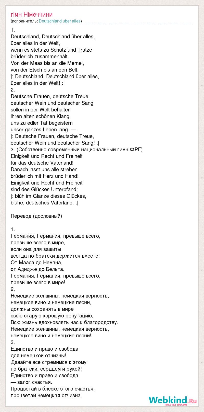 1. Deutschland, Deutschland über alles, über alles in der Welt, wenn es stets zu Schutz und Trutze brüderlich zusammenhält. Von der Maas bis an die Memel, von der Etsch bis an den Belt, |: Deutschland, Deutschland über alles, über alles in der Welt! :| 2. Deutsche Frauen, deutsche Treue, deutscher Wein und deutscher Sang sollen in der Welt behalten ihren alten schönen Klang, uns zu edler Tat begeistern unser ganzes Leben lang. — |: Deutsche Frauen, deutsche Treue, deutscher Wein und deutscher Sang! :| 3. (Собственно современный национальный гимн ФРГ) Einigkeit und Recht und Freiheit für das deutsche Vaterland! Danach lasst uns alle streben brüderlich mit Herz und Hand! Einigkeit und Recht und Freiheit sind des Glückes Unterpfand; |: blüh im Glanze dieses Glückes, blühe, deutsches Vaterland. :| Перевод (дословный) 1. Германия, Германия, превыше всего, превыше всего в мире, если она для защиты всегда по-братски держится вместе! От Мааса до Немана, от Адидже до Бельта. Германия, Германия, превыше всего, превыше всего в мире! 2. Немецкие женщины, немецкая верность, немецкое вино и немецкие песни, должны сохранять в мире свою старую хорошую репутацию, Всю жизнь вдохновлять нас к благородству. Немецкие женщины, немецкая верность, немецкое вино и немецкие песни! 3. Единство и право и свобода для немецкой отчизны! Давайте все стремимся к этому по-братски, сердцем и рукой! Единство и право и свобода — залог счастья. Процветай в блеске этого счастья, процветай немецкая отчизна