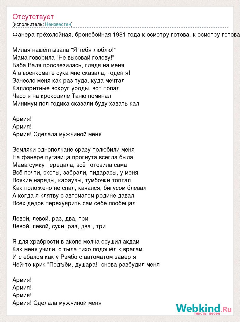 Фанера трёхслойная, бронебойная 1981 года к осмотру готова, к осмотру готова Милая нашёптывала "Я тебя люблю!" Мама говорила "Не высовай голову!" Баба Валя прослезилась, глядя на меня А в военкомате сука мне сказала, годен я! Занесло меня как раз туда, куда мечтал Каллоритные вокруг уроды, вот попал Часо я на крокодиле Таню поминал Минимум пол годика сказали буду хавать кал Армия! Армия! Армия! Сделала мужчиной меня Земляки однополчане сразу полюбили меня На фанере пугавица прогнута всегда была Мама сумку передала, всё готовила сама Всё почти, скоты, забрали, пидарасы, у меня Всякие наряды, караулы, тумбочки топтал Как положено не спал, качался, бигусом блевал А когда я клятву с автоматом родине давал Всех дедов перехуярить сам себе пообещал Левой, левой. раз, два, три Левой, левой, суки, раз, два , три Я для храбрости в акопе молча осушил акдам Как меня учили, с тыла тихо подошёл к врагам И с ебалом как у Рэмбо с автоматом замер я Чей-то крик "Подъём, душара!" снова разбудил меня Армия! Армия! Армия! Армия! Сделала мужчиной меня