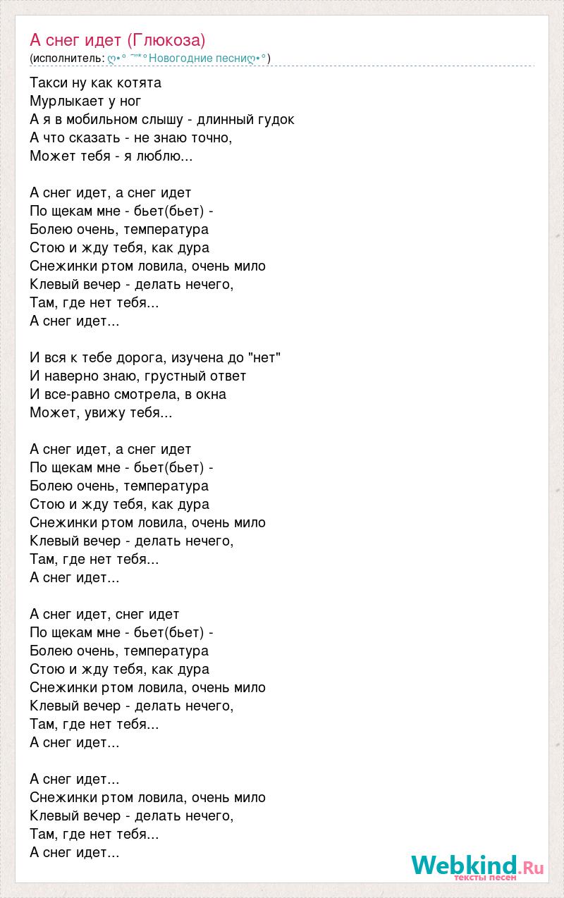 Такси ну как котята Мурлыкает у ног А я в мобильном слышу - длинный гудок А что сказать - не знаю точно, Может тебя - я люблю... А снег идет, а снег идет По щекам мне - бьет(бьет) - Болею очень, температура Стою и жду тебя, как дура Снежинки ртом ловила, очень мило Клевый вечер - делать нечего, Там, где нет тебя... А снег идет... И вся к тебе дорога, изучена до "нет" И наверно знаю, грустный ответ И все-равно смотрела, в окна Может, увижу тебя... А снег идет, а снег идет По щекам мне - бьет(бьет) - Болею очень, температура Стою и жду тебя, как дура Снежинки ртом ловила, очень мило Клевый вечер - делать нечего, Там, где нет тебя... А снег идет... А снег идет, снег идет По щекам мне - бьет(бьет) - Болею очень, температура Стою и жду тебя, как дура Снежинки ртом ловила, очень мило Клевый вечер - делать нечего, Там, где нет тебя... А снег идет... А снег идет... Снежинки ртом ловила, очень мило Клевый вечер - делать нечего, Там, где нет тебя... А снег идет...
