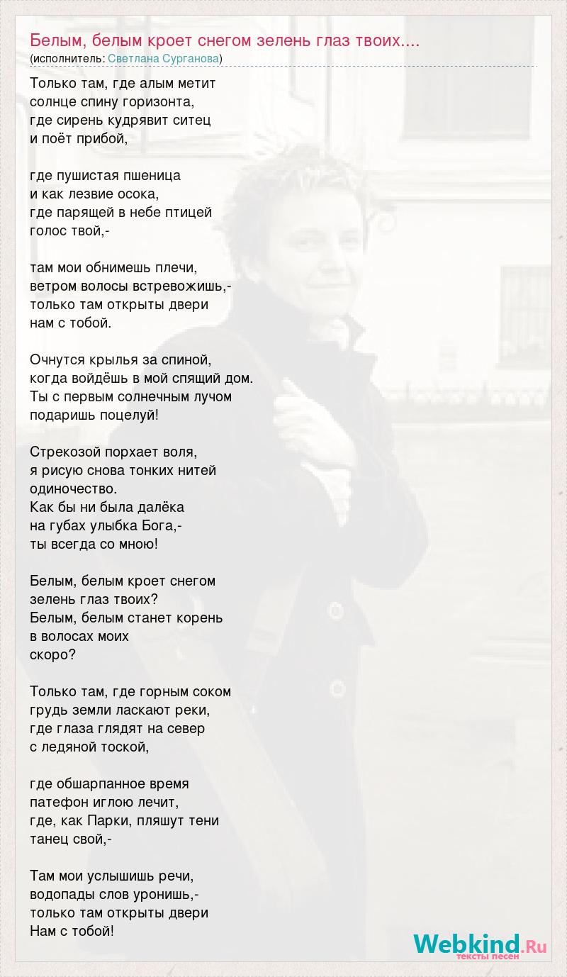 Только там, где алым метит солнце спину горизонта, где сирень кудрявит ситец и поёт прибой, где пушистая пшеница и как лезвие осока, где парящей в небе птицей голос твой,- там мои обнимешь плечи, ветром волосы встревожишь,- только там открыты двери нам с тобой. Очнутся крылья за спиной, когда войдёшь в мой спящий дом. Ты с первым солнечным лучом подаришь поцелуй! Стрекозой порхает воля, я рисую снова тонких нитей одиночество. Как бы ни была далёка на губах улыбка Бога,- ты всегда со мною! Белым, белым кроет снегом зелень глаз твоих? Белым, белым станет корень в волосах моих скоро? Только там, где горным соком грудь земли ласкают реки, где глаза глядят на север с ледяной тоской, где обшарпанное время патефон иглою лечит, где, как Парки, пляшут тени танец свой,- Там мои услышишь речи, водопады слов уронишь,- только там открыты двери Нам с тобой!