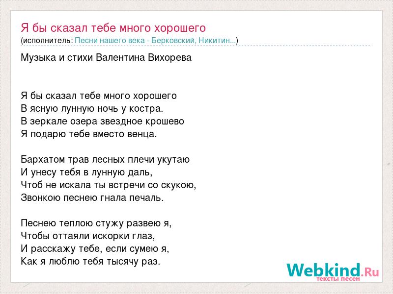 Музыка и стихи Валентина Вихорева Я бы сказал тебе много хорошего В ясную лунную ночь у костра. В зеркале озера звездное крошево Я подарю тебе вместо венца. Бархатом трав лесных плечи укутаю И унесу тебя в лунную даль, Чтоб не искала ты встречи со скукою, Звонкою песнею гнала печаль. Песнею теплою стужу развею я, Чтобы оттаяли искорки глаз, И расскажу тебе, если сумею я, Как я люблю тебя тысячу раз.