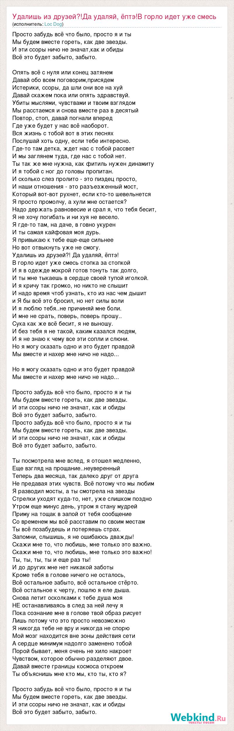Просто забудь всё что было, просто я и ты Мы будем вместе гореть, как две звезды. И эти ссоры ничо не значат,как и обиды Всё это будет забыто, забыто. Опять всё с нуля или конец затянем Давай обо всем поговорим,присядем Истерики, ссоры, да шли они все на хуй Давай скажем пока или опять здравствуй. Убиты мыслями, чувствами и твоим взглядом Мы расстаемся и снова вместе раз в десятый Повтор, стоп, давай погнали вперед Где уже будет у нас всё наоборот. Вся жизнь с тобой вот в этих песнях Послушай хоть одну, если тебе интересно. Где-то там детка, ждет нас с тобой рассвет И мы заглянем туда, где нас с тобой нет. Ты так же мне нужна, как фитиль нужен динамиту И я тобой с ног до головы пропитан. И сколько слез пролито - это пиздец просто, И наши отношения - это разъезженный мост, Который вот-вот рухнет, если кто-то шевельнется Я просто промолчу, а хули мне остается? Надо держать равновесие и срал я, что тебя бесит, Я не хочу погибать и ни хуя не весело. Я где-то там, на даче, в говно укурен И ты самая кайфовая моя дурь. Я привыкаю к тебе еще-еще сильнее Но вот отвыкнуть уже не смогу. Удалишь из друзей?! Да удаляй, ёптэ! В горло идет уже смесь стопка за стопкой И я в одежде мокрой готов тонуть так долго, И ты мне тыкаешь в сердце своей тупой иголкой. И я кричу так громко, но никто не слышит И надо время чтоб узнать, кто из нас чем дышит и Я бы всё это бросил, но нет силы воли И я люблю тебя..не причиняй мне боли. И мне не срать, поверь, поверь прошу.. Сука как же всё бесит, я не выношу. И без тебя я не такой, каким казался людям, И я не знаю к чему все эти сопли и слюни. Но я могу сказать одно и это будет правдой Мы вместе и нахер мне ничо не надо... Но я могу сказать одно и это будет правдой Мы вместе и нахер мне ничо не надо... Просто забудь всё что было, просто я и ты Мы будем вместе гореть, как две звезды. И эти ссоры ничо не значат, как и обиды Всё это будет забыто, забыто. Просто забудь всё что было, просто я и ты Мы будем вместе гореть, как две звезды. И эти ссоры ничо не значат, как и обиды Всё это будет забыто, забыто. Ты посмотрела мне вслед, я отошел медленно, Еще взгляд на прощание..неуверенный Теперь два месяца, так далеко друг от друга Не предавая этих чувств. Всё потому что мы любим Я разводил мосты, а ты смотрела на звезды Стрелки уходят куда-то, нет, уже слишком поздно Утром еще минус день, утром я стану мудрей Приму на тощак в запой от тебя сообщение Со временем мы всё расставим по своим местам Ты всё позабудешь и потеряешь страх. Запомни, слышишь, я не ошибаюсь дважды! Скажи мне то, что любишь, мне только это важно. Скажи мне то, что любишь, мне только это важно! Ты, ты, ты, ты и еще раз ты! И до других мне нет никакой заботы Кроме тебя в голове ничего не осталось, Всё остальное забыто, всё остальное стёрто. Всё остальное к черту, пошлю я еле дыша. Снова летит осколками к тебе душа моя НЕ останавливаясь в след за ней лечу я Пока сознание мне в голове твой образ рисует Лишь потому что это просто невозможно Я никогда тебе не вру и никогда не спорю Мой мозг находится вне зоны действия сети А сердце минимум надолго заменено тобой Порой бывает, меня очень не хило накроет Чувством, которое обычно разделяют двое. Давай вместе границы космоса откроем Ты объяснишь мне кто мы, кто ты, кто я? Просто забудь всё что было, просто я и ты Мы будем вместе гореть, как две звезды. И эти ссоры ничо не значат, как и обиды Вс