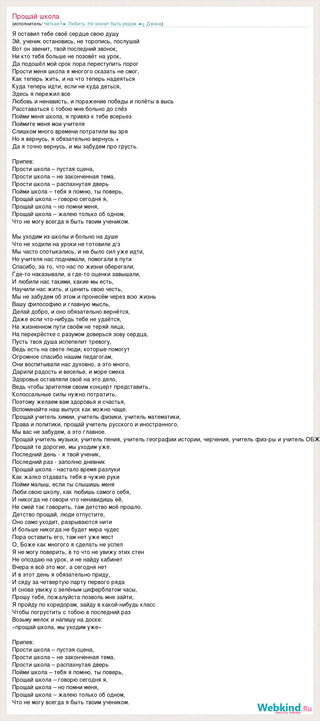Я оставил тебе своё сердце свою душу Эй, ученик остановись, не торопись, послушай Вот он звенит, твой последний звонок, Ни кто тебя больше не позовёт на урок, Да подошёл мой срок пора переступить порог Прости меня школа я многого сказать не смог, Как теперь жить, и на что теперь надеяться Куда теперь идти, если не куда деться, Здесь я пережил все Любовь и ненависть, и поражение победы и полёты в высь Расставаться с тобою мне больно до слёз Пойми меня школа, я привяз к тебе всерьез Поймите меня мои учителя Слишком много времени потратили вы зря Но я вернусь, я обязательно вернусь + Да я точно вернусь, и мы забудем про грусть. Припев: Прости школа – пустая сцена, Прости школа – не законченная тема, Прости школа – распахнутая дверь Пойми школа – тебя я помню, ты поверь, Прощай школа – говорю сегодня я, Прощай школа – но помни меня, Прощай школа – жалею только об одном, Что не могу всегда я быть твоим учеником. Мы уходим из школы и больно на душе Что не ходили на уроки не готовили д/з Мы часто спотыкались, и не было сил уже идти, Но учителя нас поднимали, помогали в пути Спасибо, за то, что нас по жизни оберегали, Где-то наказывали, а где-то оценки завышали, И любили нас такими, какие мы есть, Научили нас жить, и ценить свою честь, Мы не забудем об этом и пронесём через всю жизнь Вашу философию и главную мысль, Делай добро, и оно обязательно вернётся, Даже если что-нибудь тебе не удаётся, На жизненном пути своём не теряй лица, На перекрёстке с разумом доверься зову сердца, Пусть твоя душа испепелит тревогу, Ведь есть на свете люди, которые помогут Огромное спасибо нашим педагогам, Они воспитывали нас духовно, а это много, Дарили радость и веселье, и море смеха Здоровье оставляли своё на это дело, Ведь чтобы зрителям своим концерт представить, Колоссальные силы нужно потратить, Поэтому желаем вам здоровья и счастья, Вспоминайте наш выпуск как можно чаще. Прощай учитель химии, учитель физики, учитель математики, Права и политики, прощай учитель русского и иностранного, Мы вас не забудем, а это главное. Прощай учитель музыки, учитель пения, учитель географии истории, черчения, учитель физ-ры и учитель ОБЖ Прощай те дорогие, мы уходим уже. Последний день - я твой ученик, Последний раз - заполню дневник Прощай школа - настало время разлуки Как жалко отдавать тебя в чужие руки Пойми малыш, если ты слышишь меня Люби свою школу, как любишь самого себя, И никогда не говори что ненавидишь её, Не смей так говорить, там детство моё прошло. Детство прощай, люди отпустите, Оно само уходит, разрываются нити И больше никогда не будет мира чудес Пора оставить его, там нет уже мест О, Боже как многого я сделать не успел Я не могу поверить, в то что не увижу этих стен Не опоздаю на урок, и не найду кабинет Вчера я всё это мог, а сегодня нет И в этот день я обязательно приду, И сяду за четвертую парту первого ряда И снова увижу с зелёным циферблатом часы, Прошу тебя, пожалуйста позволь мне зайти, Я пройду по коридорам, зайду в какой-нибудь класс Чтобы погрустить с тобою в последний раз Возьму мелок и напишу на доске: «прощай школа, мы уходим уже» Припев: Прости школа – пустая сцена, Прости школа – не законченная тема, Прости школа – распахнутая дверь Пойми школа – тебя я помню, ты поверь, Прощай школа – говорю сегодня я, Прощай школа – но помни меня, Прощай школа – жалею только об одном, Что не м