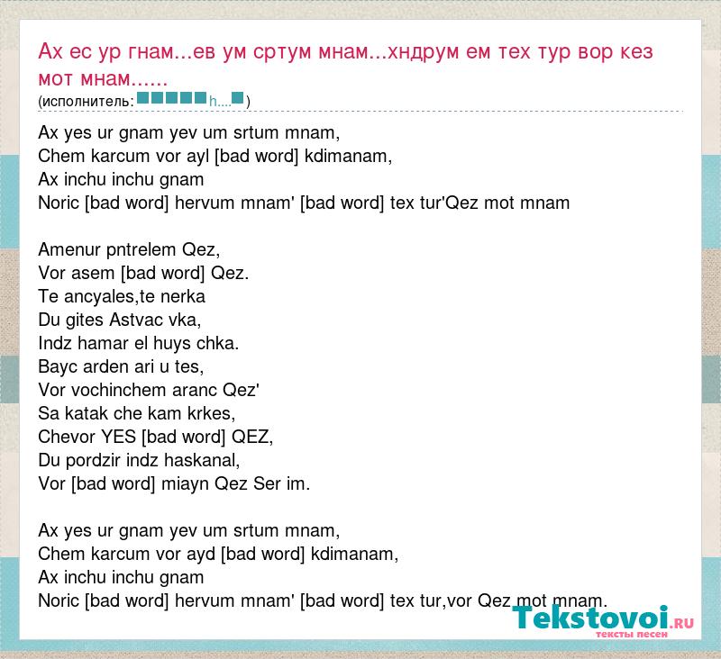 Ах ес ур гнам...ев ум сртум мнам...хндрум ем тех тур вор кез мот мнам.