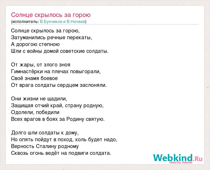 Солнце скрылось за горою, Затуманились речные перекаты, А дорогою степною Шли с войны домой советские солдаты. От жары, от злого зноя Гимнастёрки на плечах повыгорали, Своё знамя боевое От врага солдаты сердцем заслоняли. Они жизни не щадили, Защищая отчий край, страну родную, Одолели, победили Всех врагов в боях за Родину святую. Долго шли солдаты к дому, Но опять пойдут в поход, коль будет надо, Верность Сталину родному Сквозь огонь ведёт на подвиги солдата.