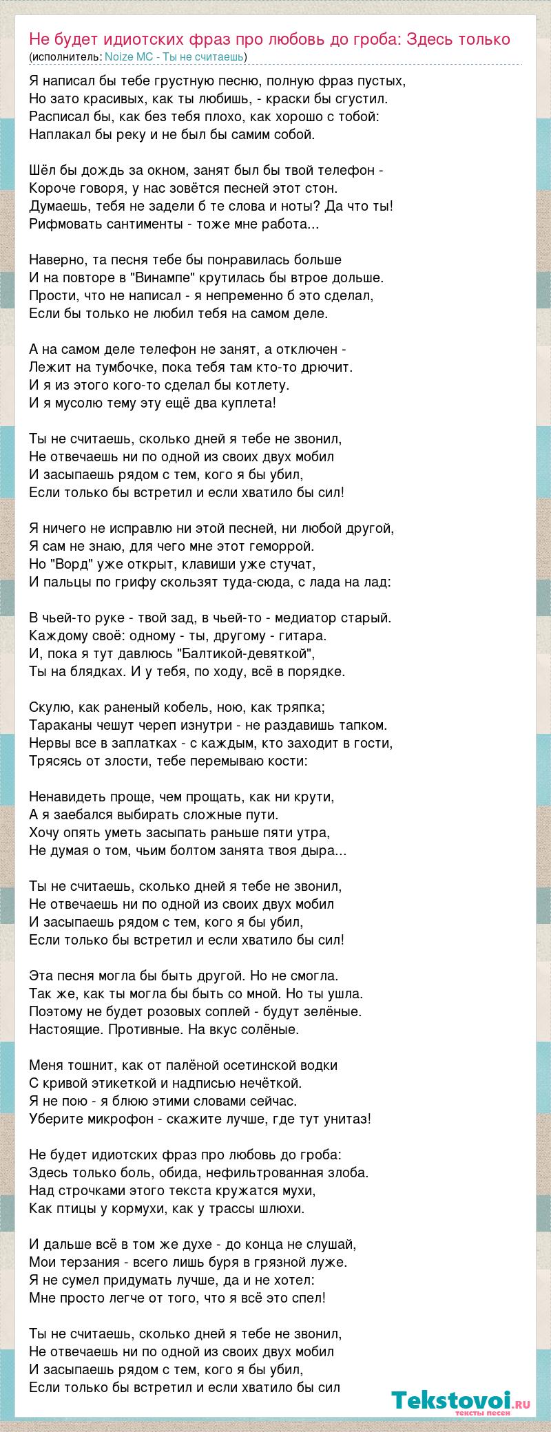 Главная→Исполнители→Noize MC - Ты не считаешь→Не будет идиотских фраз про любовь до гроба: Здесь только боль, обида, нефильтро