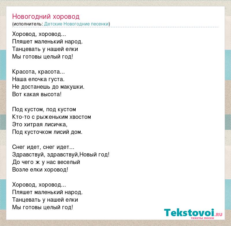 Хоровод, хоровод... Пляшет маленький народ. Танцевать у нашей елки Мы готовы целый год! Красота, красота... Наша елочка густа. Не достанешь до макушки. Вот какая высота! Под кустом, под кустом Кто-то с рыженьким хвостом Это хитрая лисичка, Под кусточком лисий дом. Снег идет, снег идет... Здравствуй, здравствуй,Новый год! До чего ж у нас веселый Возле елки хоровод! Хоровод, хоровод... Пляшет маленький народ. Танцевать у нашей елки Мы готовы целый год!