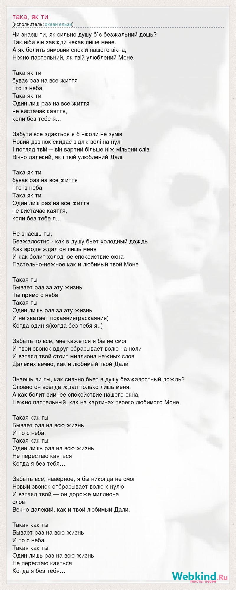 Чи знаєш ти, як сильно душу б`є безжальний дощь? Так ніби він завжди чекав лише мене. А як болить зимовий спокій нашого вікна, Ніжно пастельний, як твій улюблений Моне. Така як ти буває раз на все життя і то із неба. Така як ти Один лиш раз на все життя не вистачає каяття, коли без тебе я... Забути все здається я б ніколи не зумів Новий дзвінок скидає відлік волі на нулі І погляд твій -- він вартий більше ніж мільони слів Вічно далекий, як і твій улюблений Далі. Така як ти буває раз на все життя і то із неба. Така як ти Один лиш раз на все життя не вистачає каяття, коли без тебе я... Не знаешь ты, Безжалостно - как в душу бьет холодный дождь Как вроде ждал он лишь меня И как болит холодное спокойствие окна Пастельно-нежное как и любимый твой Моне Такая ты Бывает раз за эту жизнь Ты прямо с неба Такая ты Один лишь раз за эту жизнь И не хватает покаяния(раскаяния) Когда один я(когда без тебя я..) Забыть то все, мне кажется я бы не смог И твой звонок вдруг сбрасывает волю на ноли И взгляд твой стоит миллиона нежных слов Далеких вечно, как и любимый твой Дали Знаешь ли ты, как сильно бьет в душу безжалостный дождь? Словно он всегда ждал только лишь меня. А как болит зимнее спокойствие нашего окна, Нежно пастельный, как на картинах твоего любимого Моне. Такая как ты Бывает раз на всю жизнь И то с неба. Такая как ты Один лишь раз на всю жизнь Не перестаю каяться Когда я без тебя… Забыть все, наверное, я бы никогда не смог Новый звонок отбрасывает волю к нулю И взгляд твой — он дороже миллиона слов Вечно далекий, как и твой любимый Дали. Такая как ты Бывает раз на всю жизнь И то с неба. Такая как ты Один лишь раз на всю жизнь Не перестаю каяться Когда я без тебя…