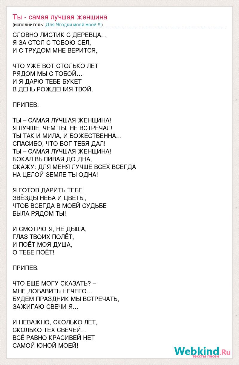 СЛОВНО ЛИСТИК С ДЕРЕВЦА… Я ЗА СТОЛ С ТОБОЮ СЕЛ, И С ТРУДОМ МНЕ ВЕРИТСЯ, ЧТО УЖЕ ВОТ СТОЛЬКО ЛЕТ РЯДОМ МЫ С ТОБОЙ… И Я ДАРЮ ТЕБЕ БУКЕТ В ДЕНЬ РОЖДЕНИЯ ТВОЙ. ПРИПЕВ: ТЫ – САМАЯ ЛУЧШАЯ ЖЕНЩИНА! Я ЛУЧШЕ, ЧЕМ ТЫ, НЕ ВСТРЕЧАЛ! ТЫ ТАК И МИЛА, И БОЖЕСТВЕННА… СПАСИБО, ЧТО БОГ ТЕБЯ ДАЛ! ТЫ – САМАЯ ЛУЧШАЯ ЖЕНЩИНА! БОКАЛ ВЫПИВАЯ ДО ДНА, СКАЖУ: ДЛЯ МЕНЯ ЛУЧШЕ ВСЕХ ВСЕГДА НА ЦЕЛОЙ ЗЕМЛЕ ТЫ ОДНА! Я ГОТОВ ДАРИТЬ ТЕБЕ ЗВЁЗДЫ НЕБА И ЦВЕТЫ, ЧТОБ ВСЕГДА В МОЕЙ СУДЬБЕ БЫЛА РЯДОМ ТЫ! И СМОТРЮ Я, НЕ ДЫША, ГЛАЗ ТВОИХ ПОЛЁТ, И ПОЁТ МОЯ ДУША, О ТЕБЕ ПОЁТ! ПРИПЕВ. ЧТО ЕЩЁ МОГУ СКАЗАТЬ? – МНЕ ДОБАВИТЬ НЕЧЕГО… БУДЕМ ПРАЗДНИК МЫ ВСТРЕЧАТЬ, ЗАЖИГАЮ СВЕЧИ Я… И НЕВАЖНО, СКОЛЬКО ЛЕТ, СКОЛЬКО ТЕХ СВЕЧЕЙ… ВСЁ РАВНО КРАСИВЕЙ НЕТ САМОЙ ЮНОЙ МОЕЙ!
