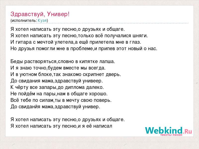 Я хотел написать эту песню,о друзьях и общаге. Я хотел написать эту песню,только всё получалися шняги. И гитара с мечтой улетела,а ещё прилетела мне в глаз. Но друзья помогли мне в проблеме,и припев этот новый о нас. Беды растворяться,словно в кипятке лапша. И я знаю точно,будем вместе мы всегда. И в уютном блоке,так знакомо скрипнет дверь. До свидания мама,здравствуй унивеер. К чёрту все запары,до диплома далеко. Не пойдём на пары,нам в общаге хорошо. Всё тебе по силам,ты в мечту свою поверь. До свиданйя мама,здравствуй универ. Я хотел написать эту песню,о друзьях и общаге. Я хотел написать эту песню,и я её написал
