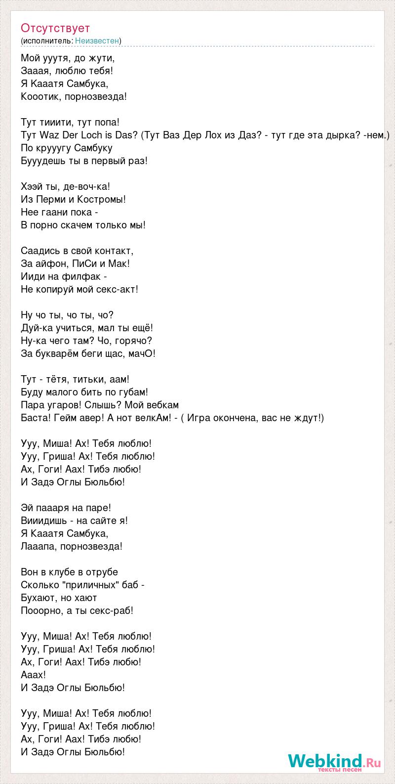 Мой ууутя, до жути, Зааая, люблю тебя! Я Kааатя Самбука, Кооотик, порнозвезда! Тут тииити, тут попа! Тут Waz Der Loсh is Das? (Тут Ваз Дер Лох из Даз? - тут где эта дырка? -нем.) По крууугу Самбуку Бууудешь ты в первый раз! Хээй ты, де-воч-ка! Из Перми и Костромы! Нее гаани пока - В порно скачем только мы! Саадись в свой контакт, За айфон, ПиСи и Мак! Ииди на филфак - Не копируй мой секс-акт! Ну чо ты, чо ты, чо? Дуй-ка учиться, мал ты ещё! Ну-ка чего там? Чо, горячо? За букварём беги щас, мачО! Тут - тётя, титьки, аам! Буду малого бить по губам! Пара угаров! Слышь? Мой вебкам Баста! Гейм авер! А нот велкАм! - ( Игра окончена, вас не ждут!) Ууу, Миша! Ах! Тебя люблю! Ууу, Гриша! Ах! Тебя люблю! Ах, Гоги! Аах! Тибэ любю! И Задэ Оглы Бюльбю! Эй паааря на паре! Вииидишь - на сайте я! Я Кааатя Самбука, Лааапа, порнозвезда! Вон в клубе в отрубе Сколько "приличных" баб - Бухают, но хают Пооорно, а ты секс-раб! Ууу, Миша! Ах! Тебя люблю! Ууу, Гриша! Ах! Тебя люблю! Ах, Гоги! Аах! Тибэ любю! Ааах! И Задэ Оглы Бюльбю! Ууу, Миша! Ах! Тебя люблю! Ууу, Гриша! Ах! Тебя люблю! Ах, Гоги! Аах! Тибэ любю! И Задэ Оглы Бюльбю!