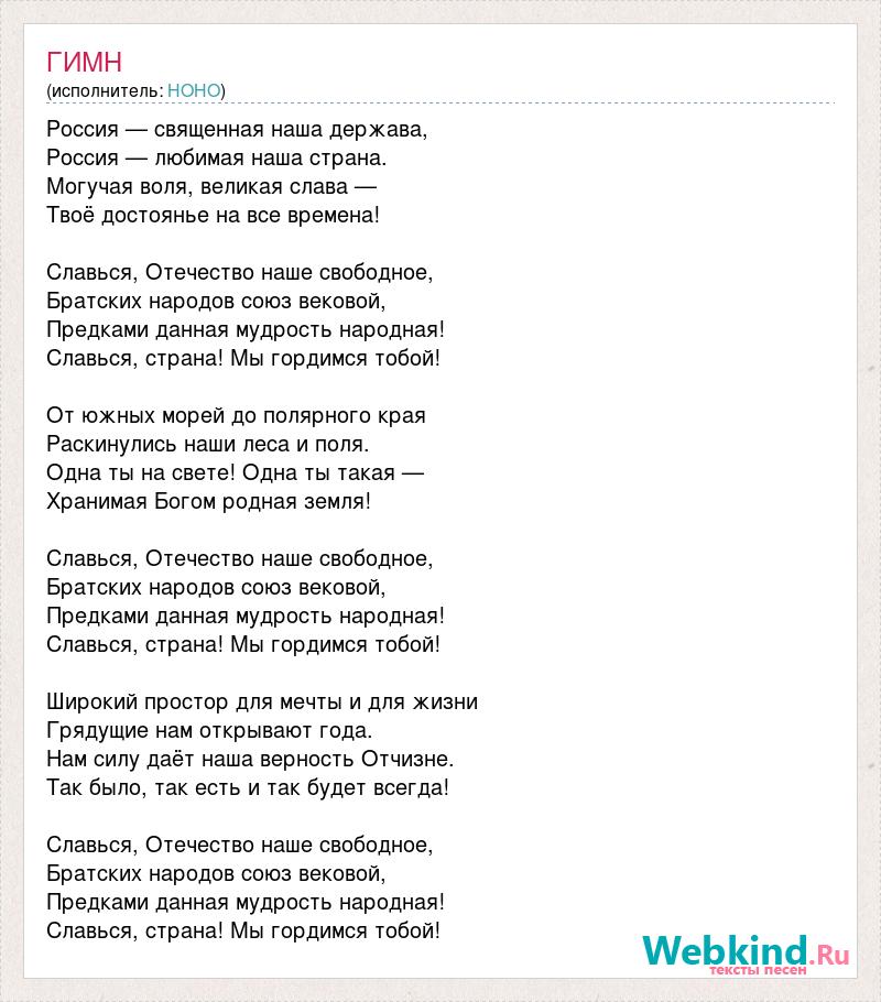 Россия — священная наша держава, Россия — любимая наша страна. Могучая воля, великая слава — Твоё достоянье на все времена! Славься, Отечество наше свободное, Братских народов союз вековой, Предками данная мудрость народная! Славься, страна! Мы гордимся тобой! От южных морей до полярного края Раскинулись наши леса и поля. Одна ты на свете! Одна ты такая — Хранимая Богом родная земля! Славься, Отечество наше свободное, Братских народов союз вековой, Предками данная мудрость народная! Славься, страна! Мы гордимся тобой! Широкий простор для мечты и для жизни Грядущие нам открывают года. Нам силу даёт наша верность Отчизне. Так было, так есть и так будет всегда! Славься, Отечество наше свободное, Братских народов союз вековой, Предками данная мудрость народная! Славься, страна! Мы гордимся тобой!